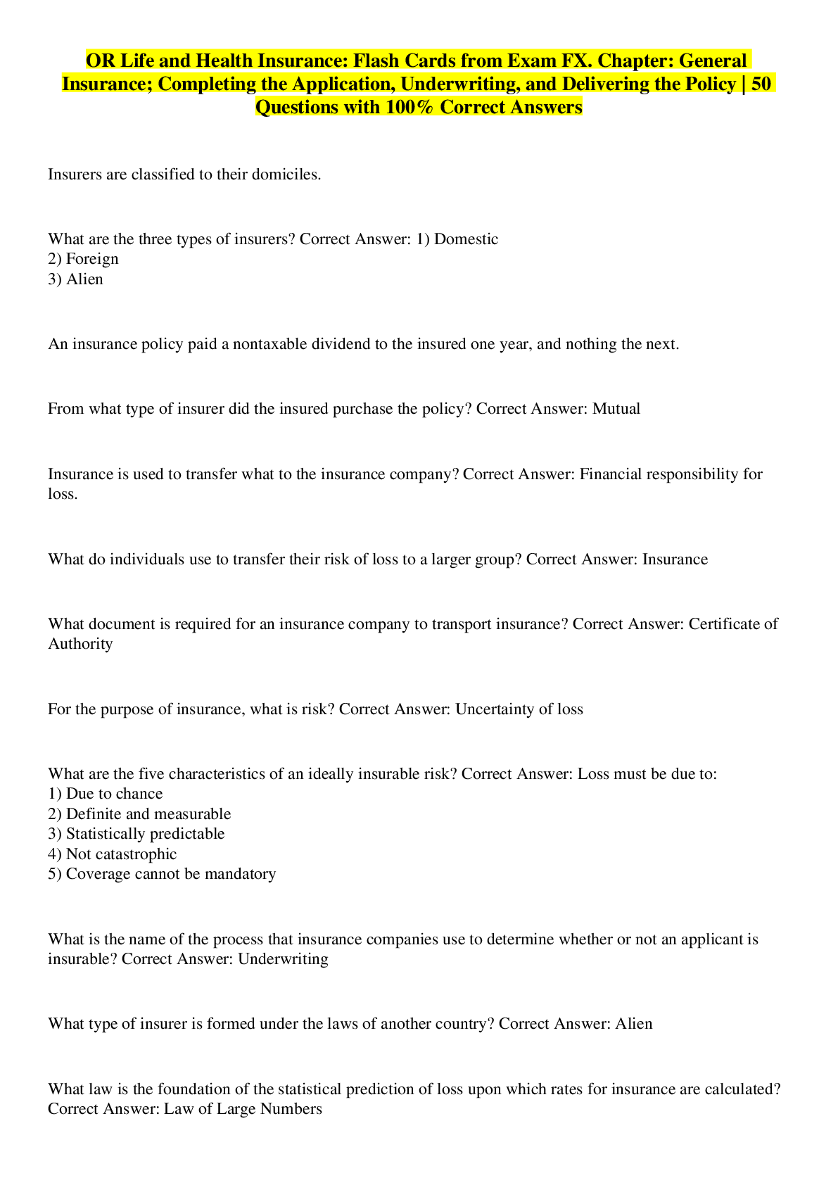Business> EXAM > 1 - ExamFX Life and Health - General Insurance / Completing Application, Underwriting and Delivering The Policy | 50 Questions with 100% Correct Answers (All)
