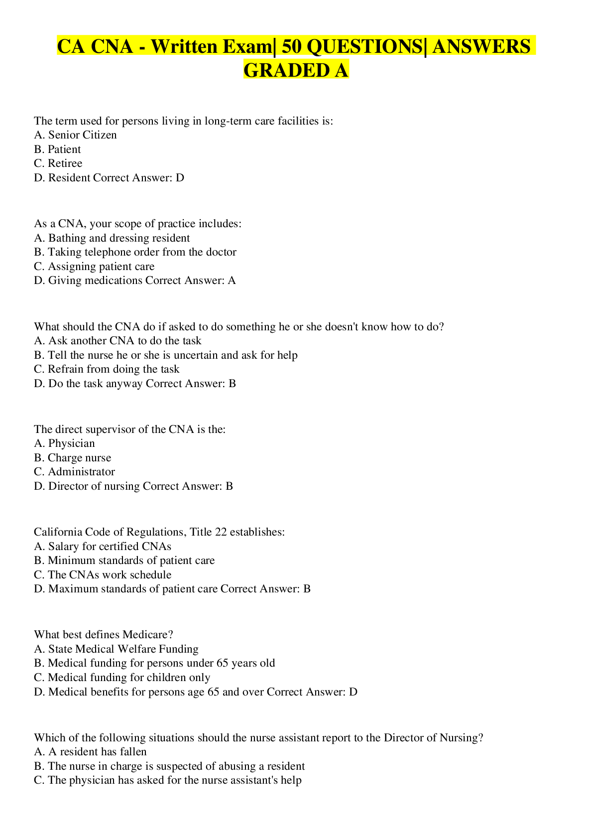 Health Care> EXAM > CA CNA - Written Exam| 50 QUESTIONS| ANSWERS GRADED A (All)