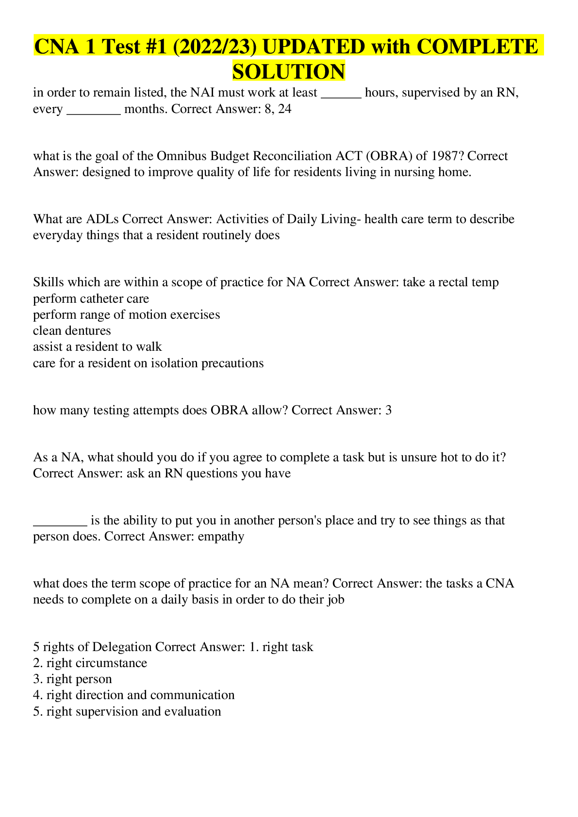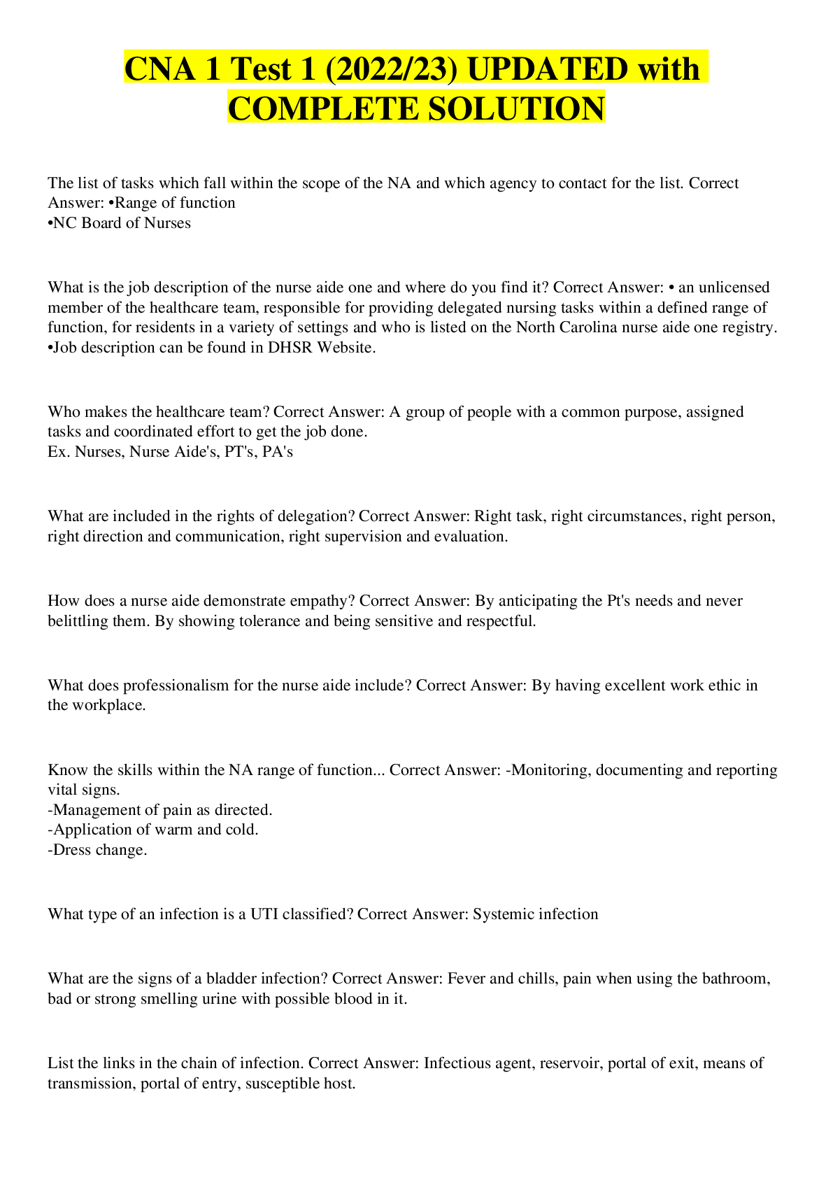 Health Care> EXAM > CNA 1 Test 1 (2022/23) UPDATED with COMPLETE SOLUTION (All)