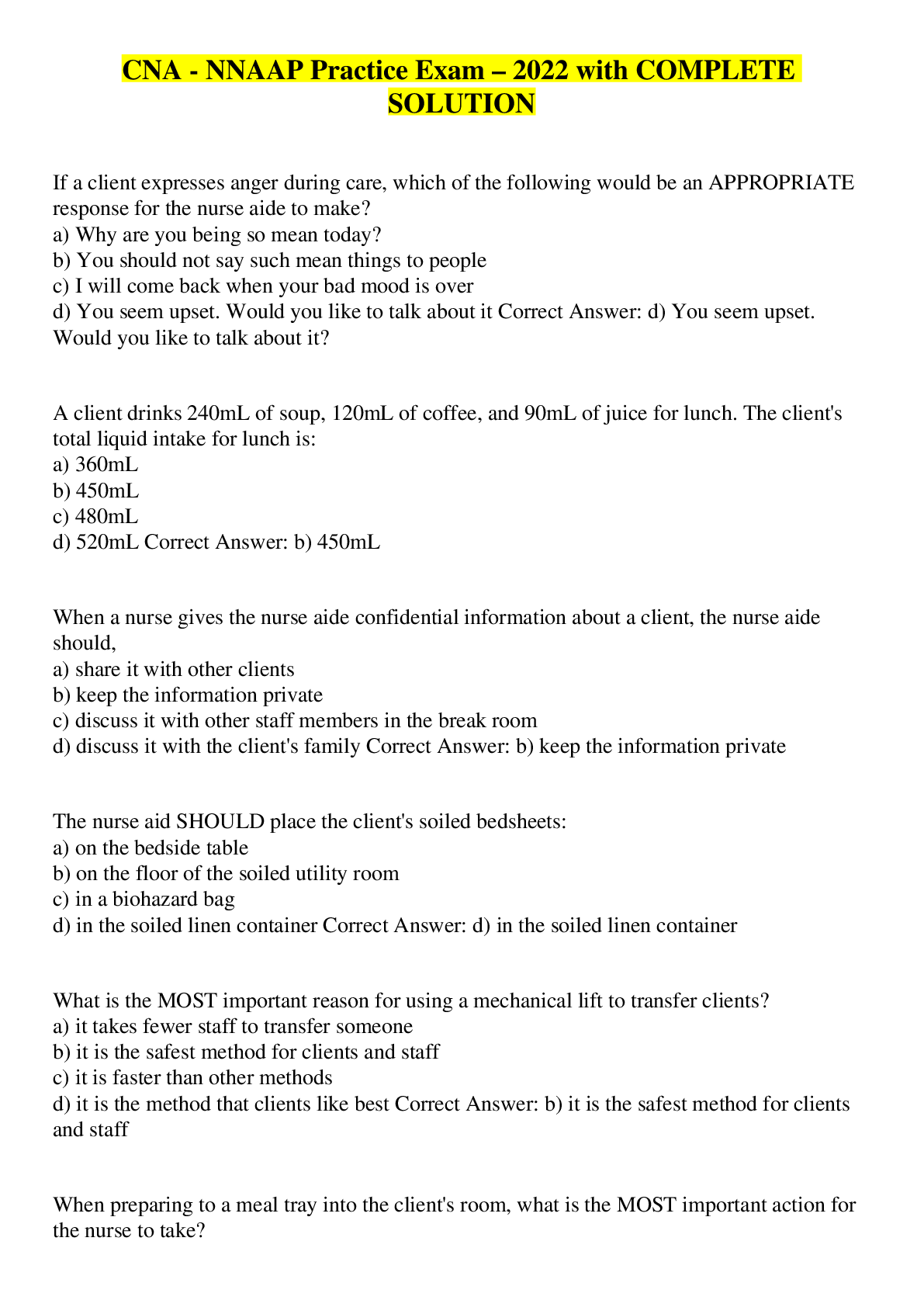 Health Care> EXAM > 2022 NNAAP Nurse Aide Practice Written Exam, CNA - NNAAP Practice Exam - 2021, CNA Practice Questions 2016, 2018 CNA practice test, Certified Nursing Assistant (CNA) Practice Exam (Edition 2019), NNAAP NURSE AIDE PRACTICE WRITTEN EXAM 2020 (All)