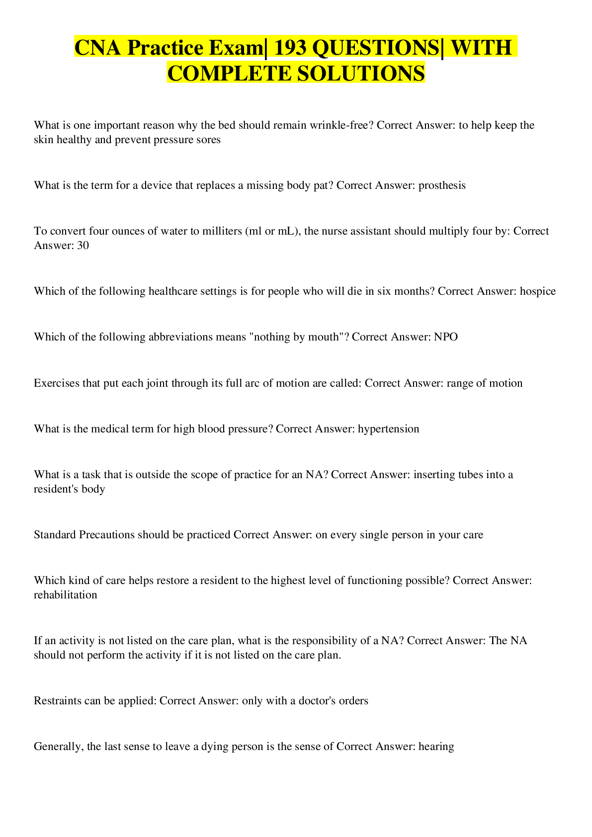 Health Care> EXAM > CNA Practice Exam| 193 QUESTIONS| WITH COMPLETE SOLUTIONS (All)