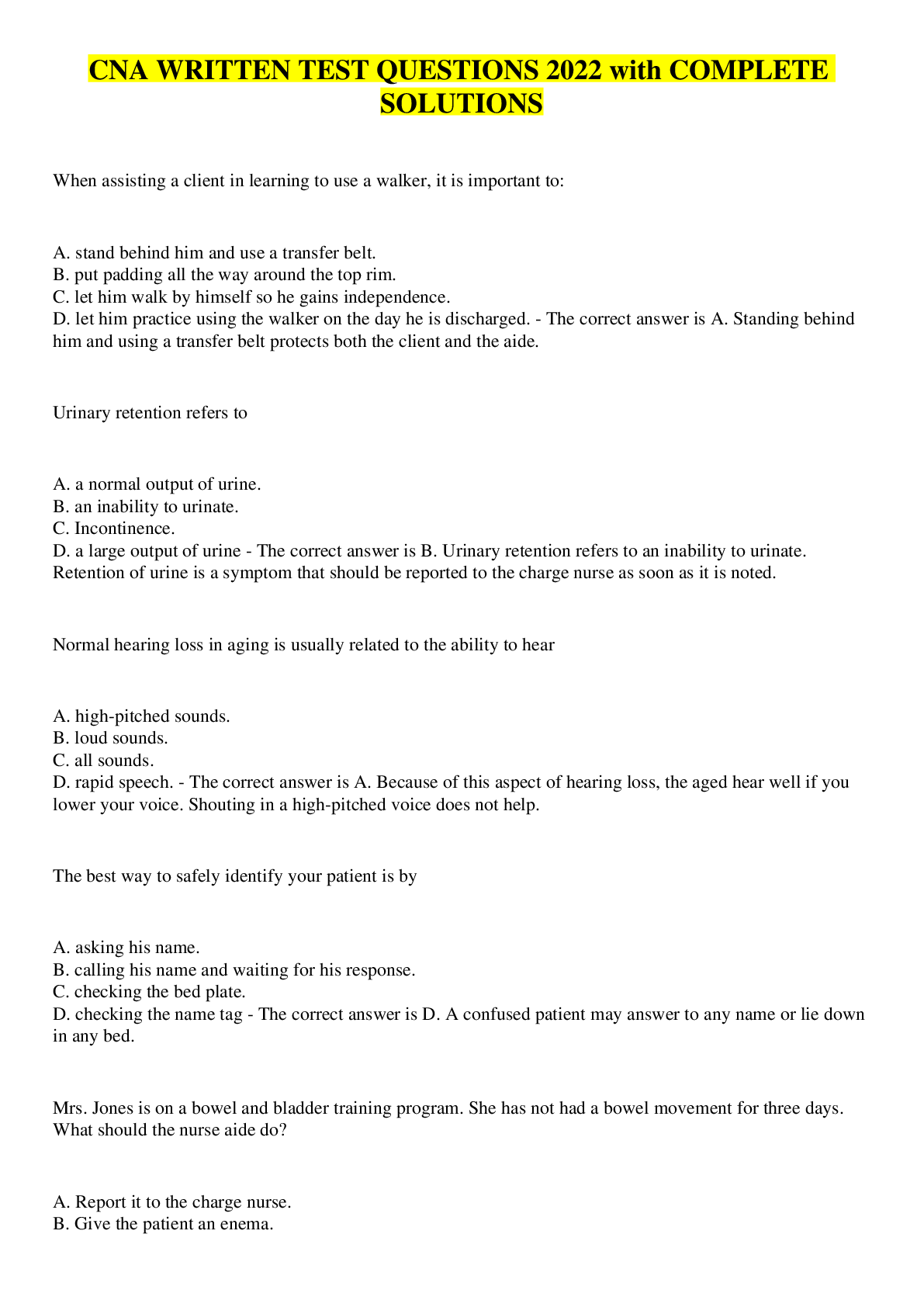 Health Care> EXAM > CNA WRITTEN TEST QUESTIONS 2022 with COMPLETE SOLUTIONS (All)