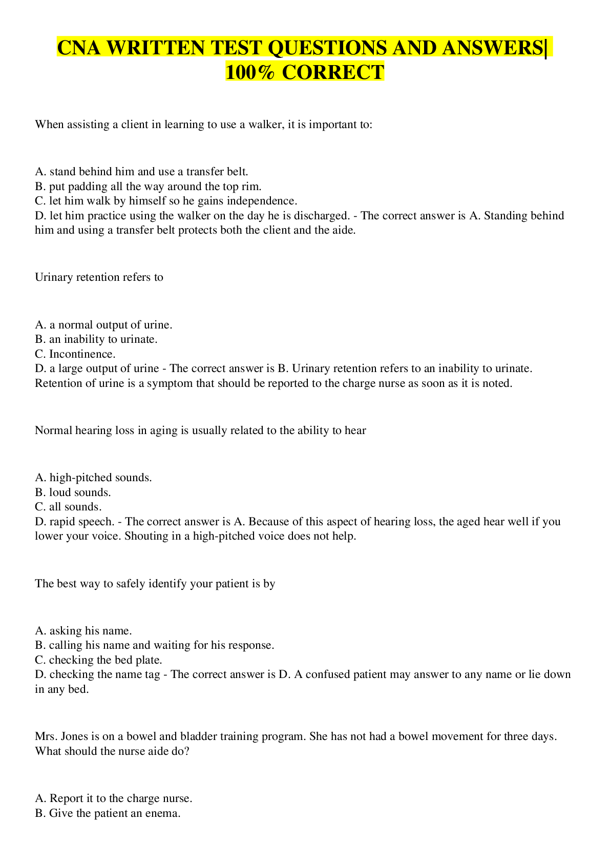 Health Care> EXAM > CNA WRITTEN TEST QUESTIONS AND ANSWERS| 100% CORRECT (All)