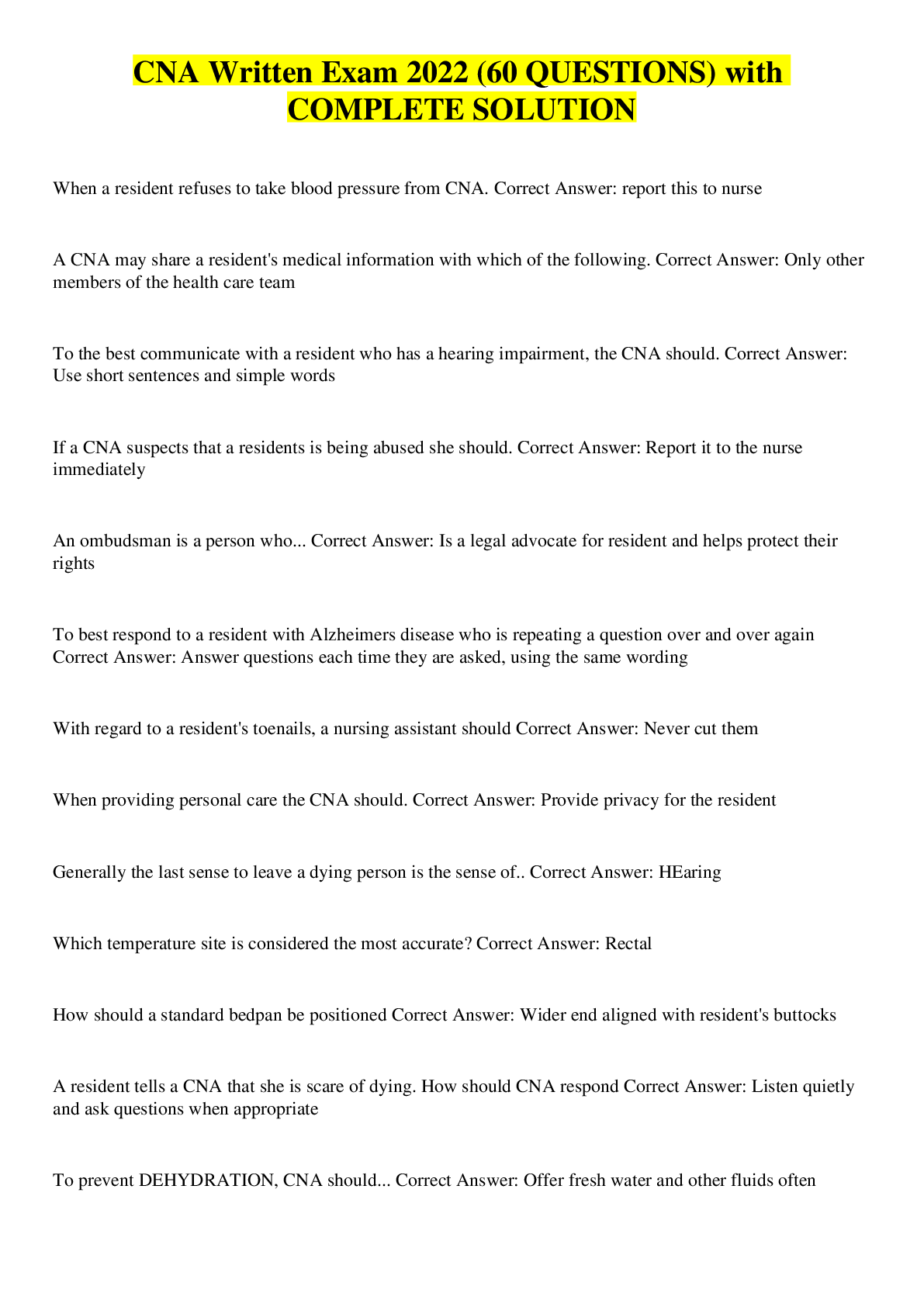 Health Care> EXAM > CNA Written Exam 2022 (60 QUESTIONS) with COMPLETE SOLUTION (All)