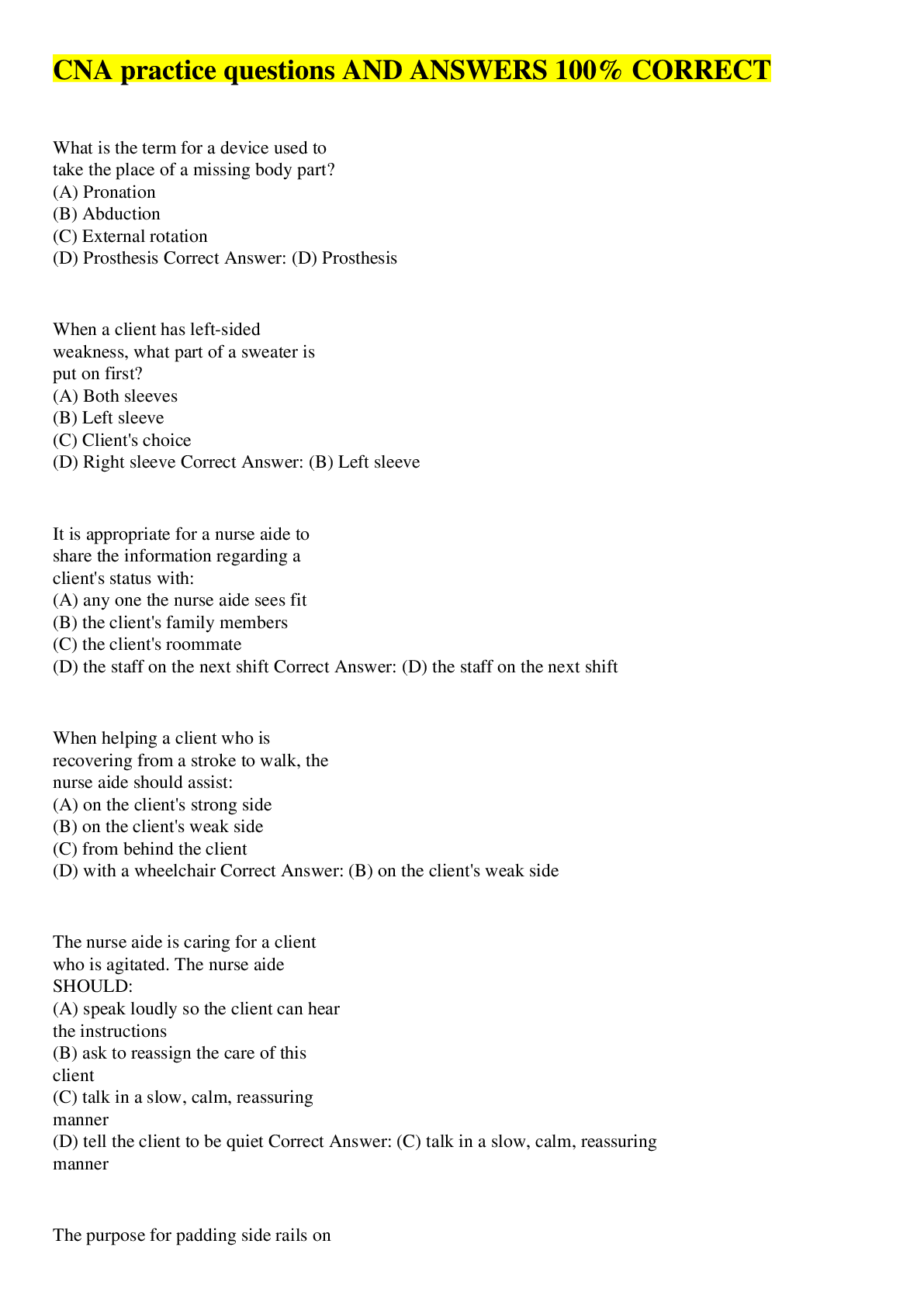 Health Care> EXAM > CNA practice questions AND ANSWERS 100% CORRECT (All)