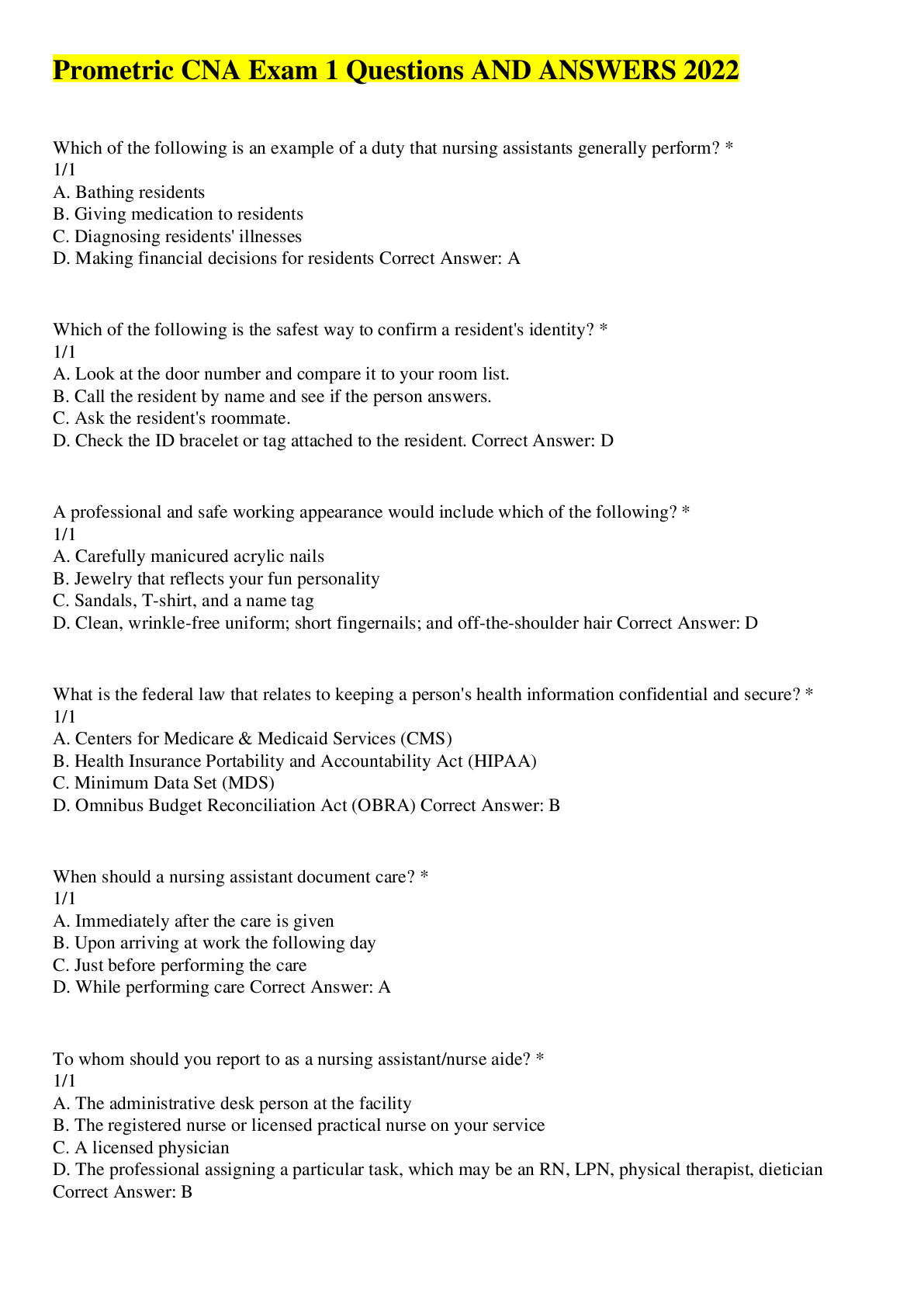 Health Care> EXAM > Prometric CNA Exam 1 Questions AND ANSWERS 2022 (All)