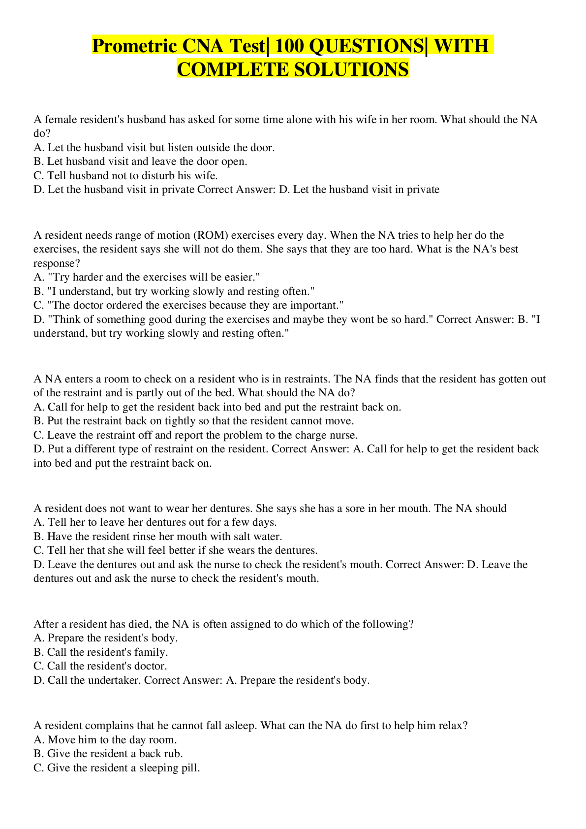 Health Care> EXAM > Prometric CNA Test| 100 QUESTIONS| WITH COMPLETE SOLUTIONS (All)