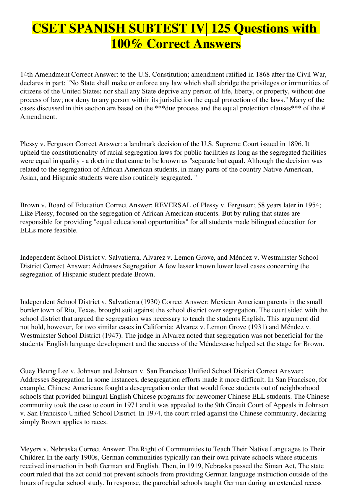 Sociology> EXAM > CSET Spanish Subtest IV| Questions with 100% Correct Answers (All)