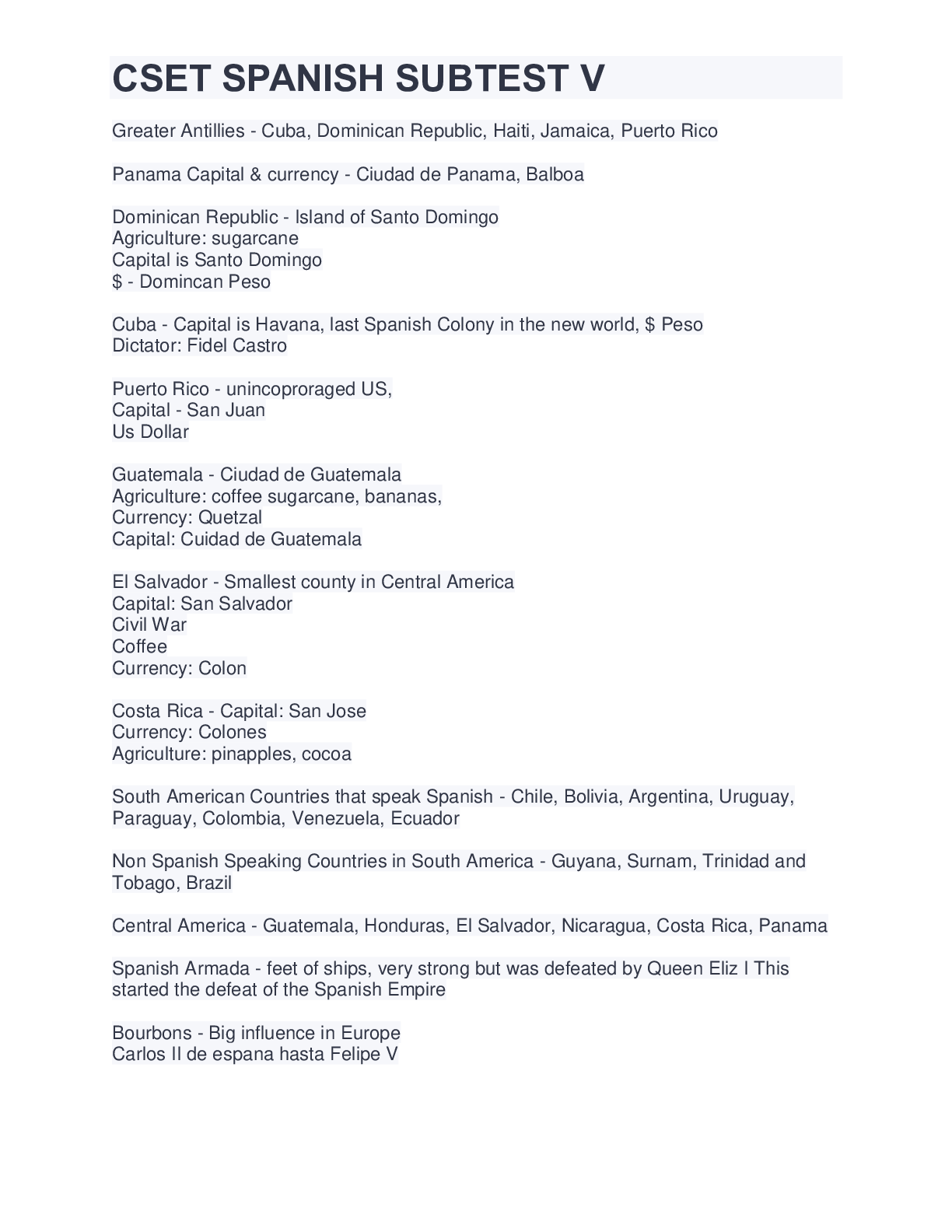 Greater Antillies Correct Answer: Cuba, Dominican Republic, Haiti, Jamaica, Puerto Rico Panama Capital & currency Correct Answer: Ciudad de Panama, Balboa Dominican Republic Correct Answer: I...