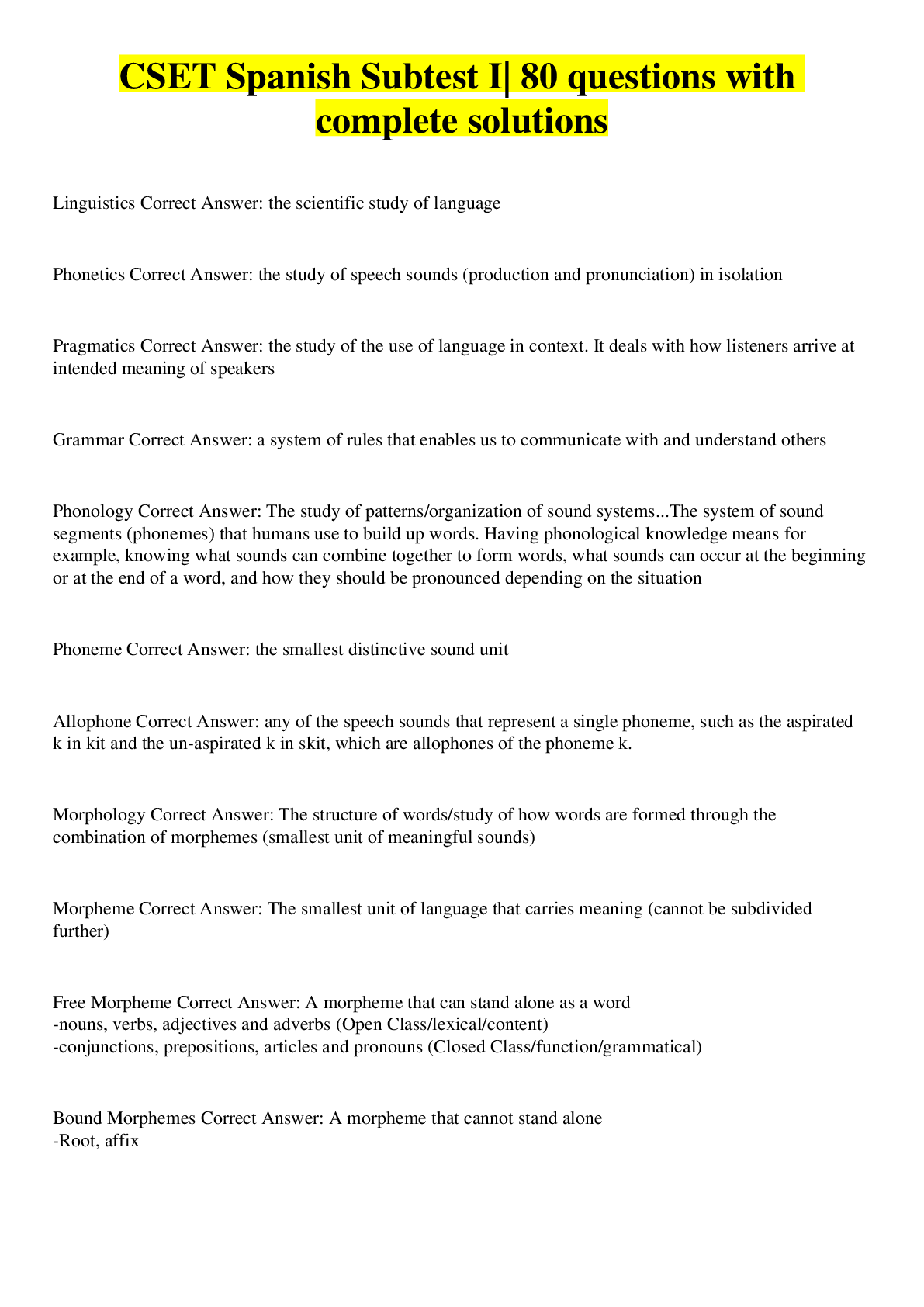 Sociology> EXAM > CSET- Spanish Subtest 1| Questions with 100% Correct Answers (All)