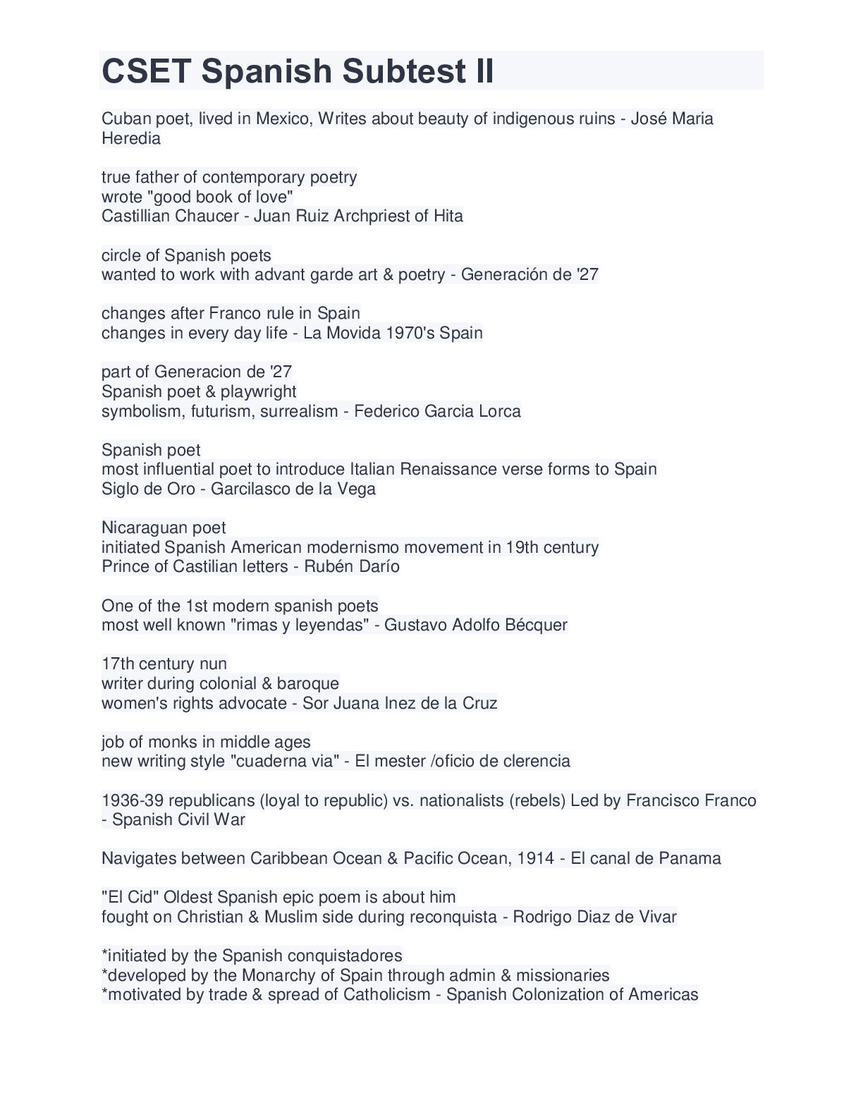 Cuban poet, lived in Mexico, Writes about beauty of indigenous ruins Correct Answer: José Maria Heredia true father of contemporary poetry wrote "good book of love" Castillian Chaucer Correct An...