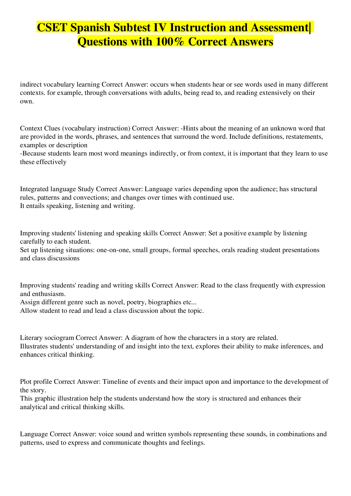 Sociology> EXAM > CSET SPANISH SUBTEST V| Questions with 100% Correct Answers (All)