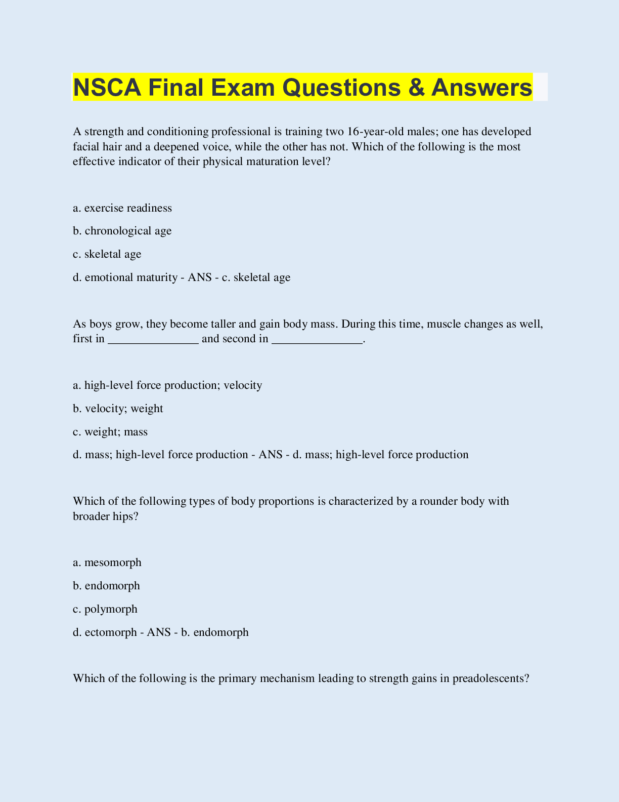 Health Care> EXAM > NSCA Final Exam Questions & Answers | 70 Questions with 100% Correct Answers | Updated & Verified | 20 Pages (All)