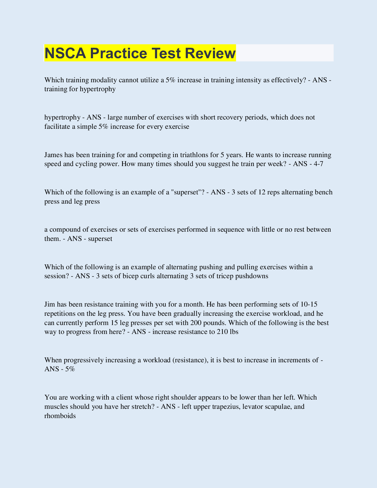 Health Care> EXAM REVIEW > NSCA Practice Test Review | 85 Questions with 100% Correct Answers | Updated & Verified (All)