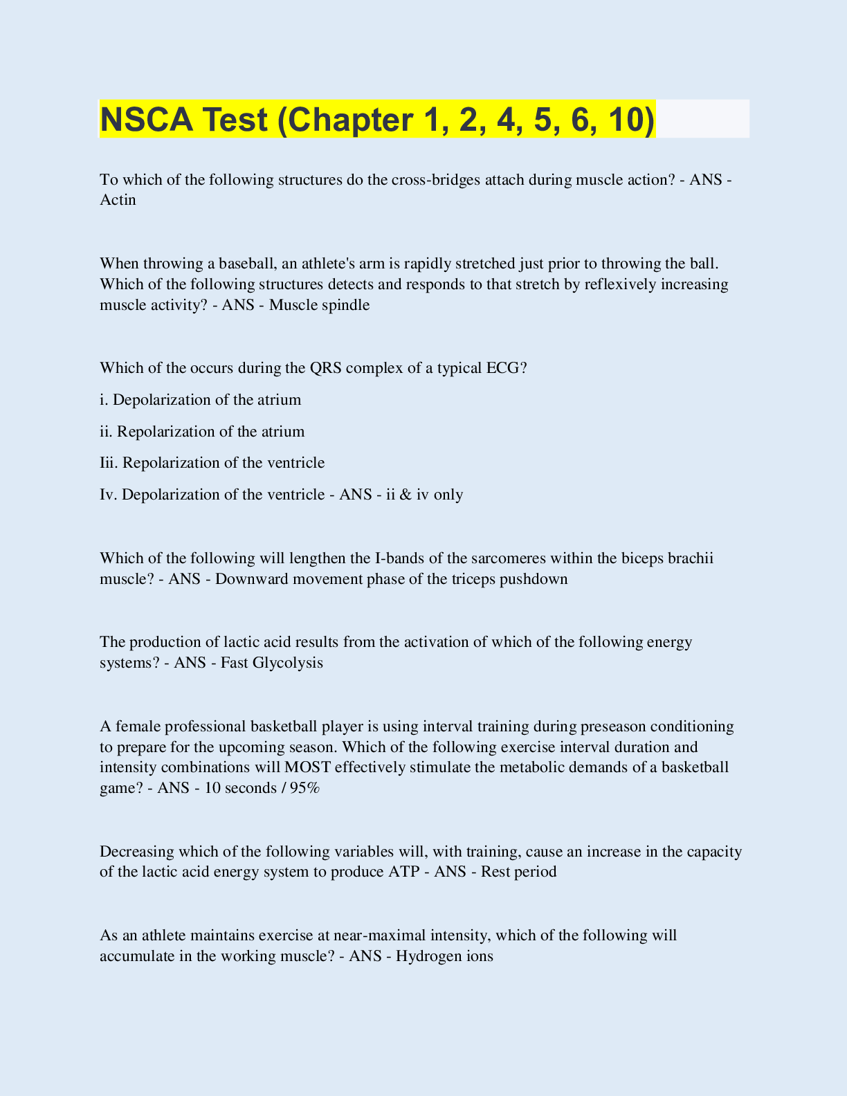 Health Care> EXAM > NSCA Test Questions & Answers (Chapter 1, 2, 4, 5, 6, 10) | 70 Questions with 100% Correct Answers | Updated & Verified (All)