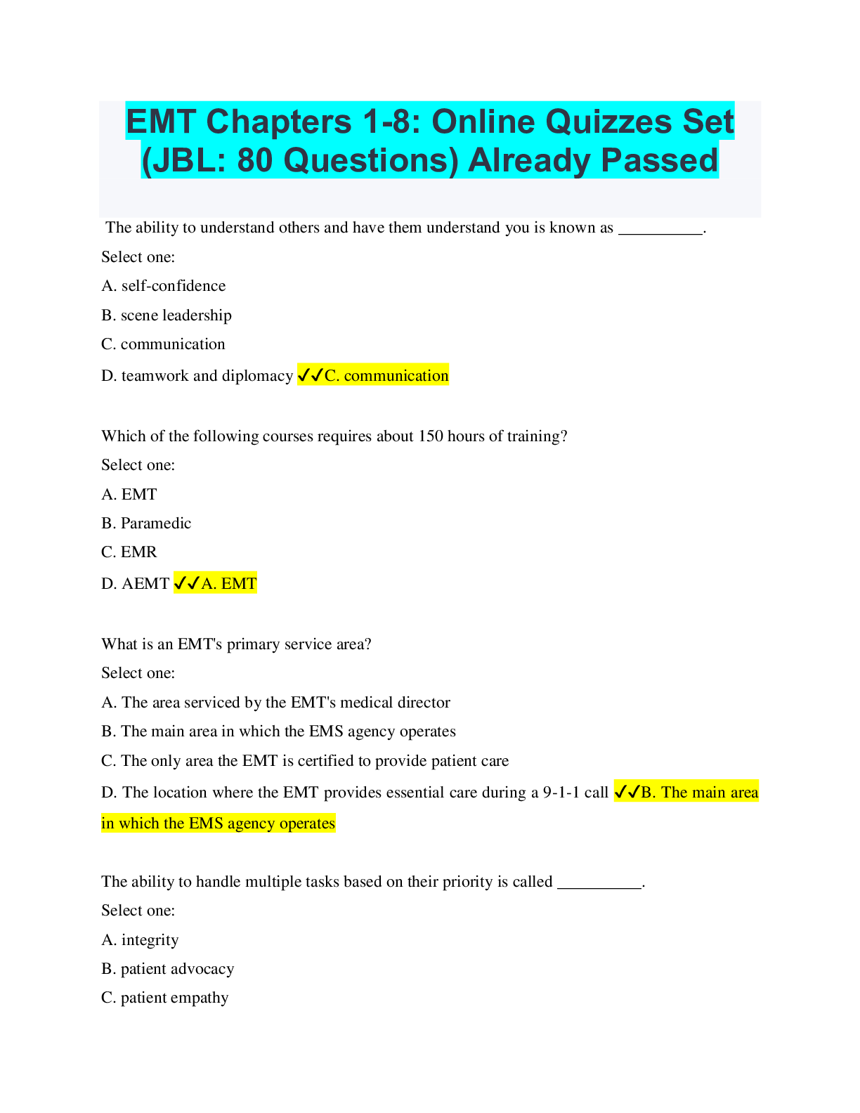 Health Care> EXAM > EMT Exam 1 (Chapters 1-8) Questions and Answers with Complete Solutions (All)