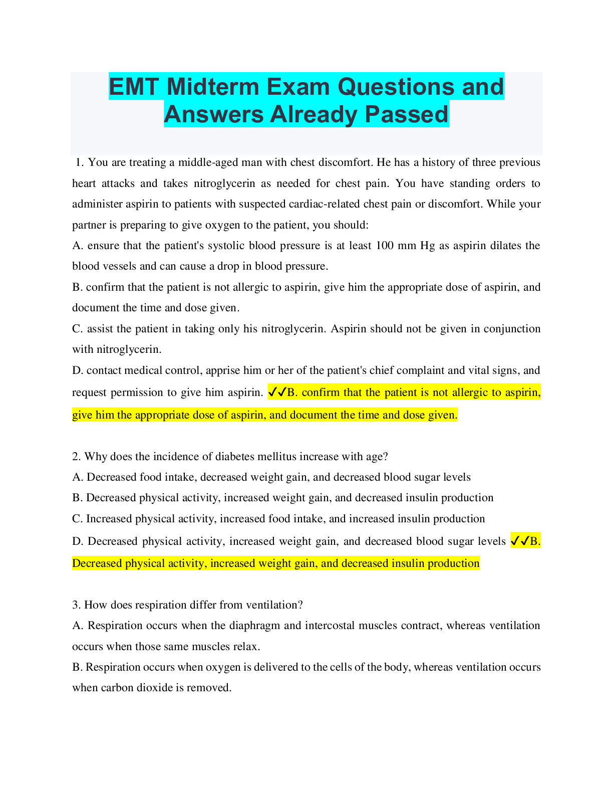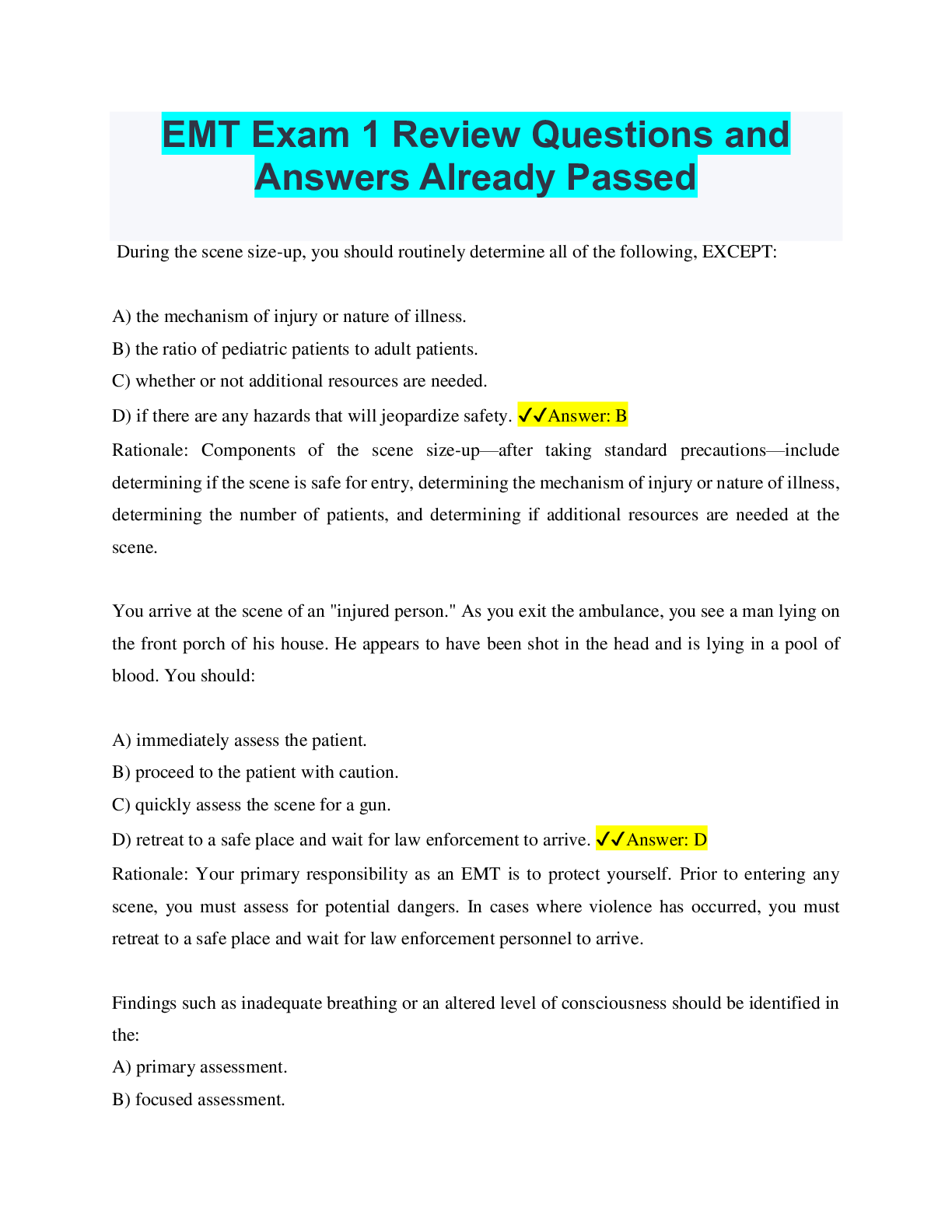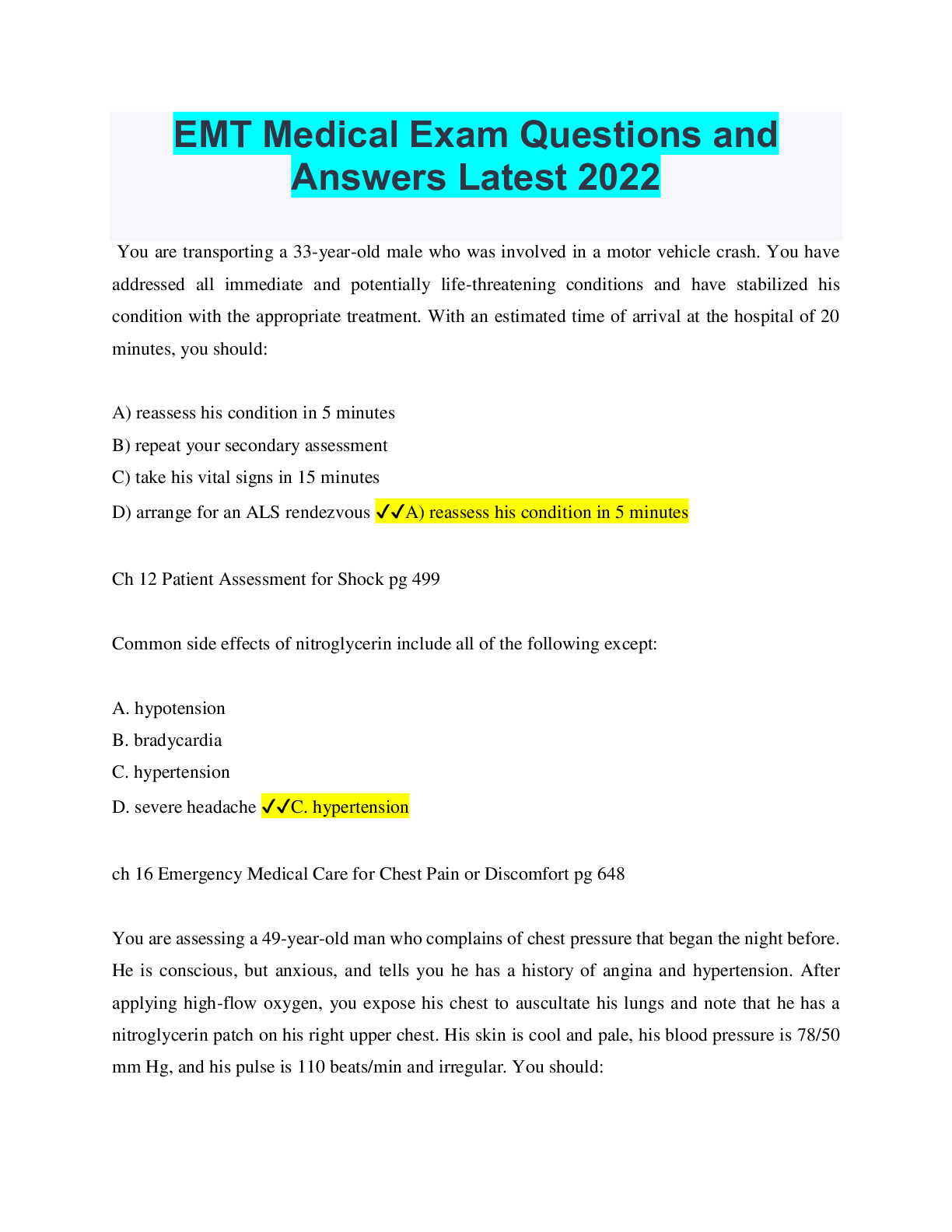 Health Care> EXAM > EMT Medical Exam Questions and Answers Latest 2022 (All)