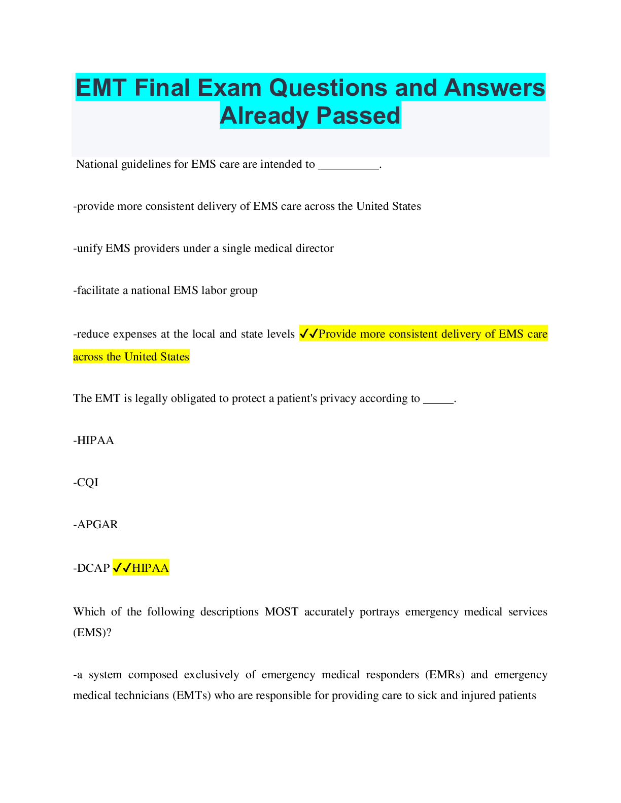 Medical Studies> EXAM > EMT Final Exam Questions and Answers Already Passed (All)