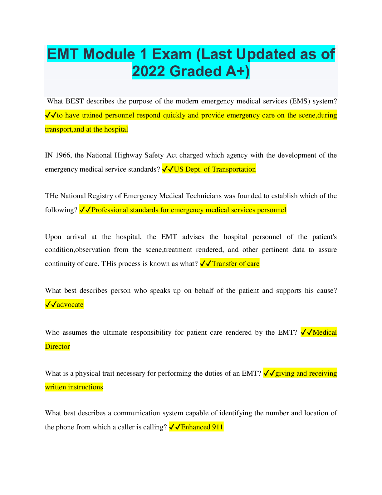 Health Care> EXAM > EMT Module 1 Exam (Last Updated as of 2022 Graded A+) (All)