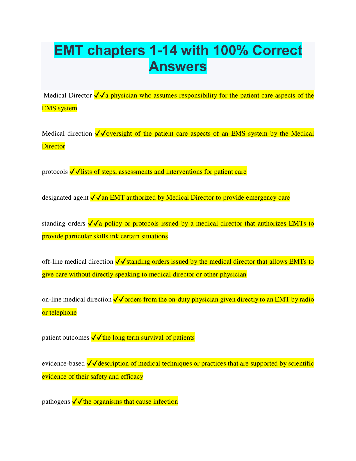 Health Care> EXAM > EMT chapters 1-14 with 100% Correct Answers (All)