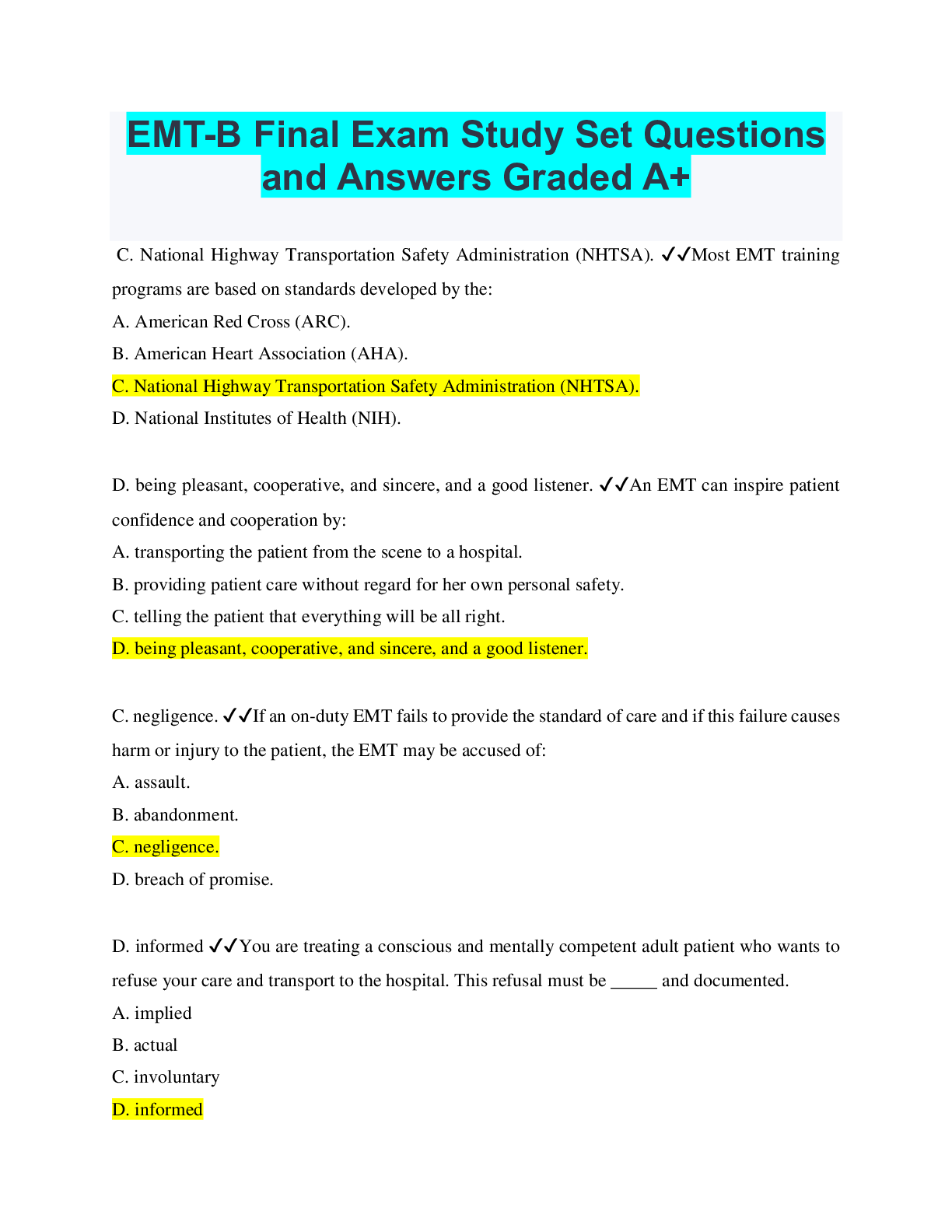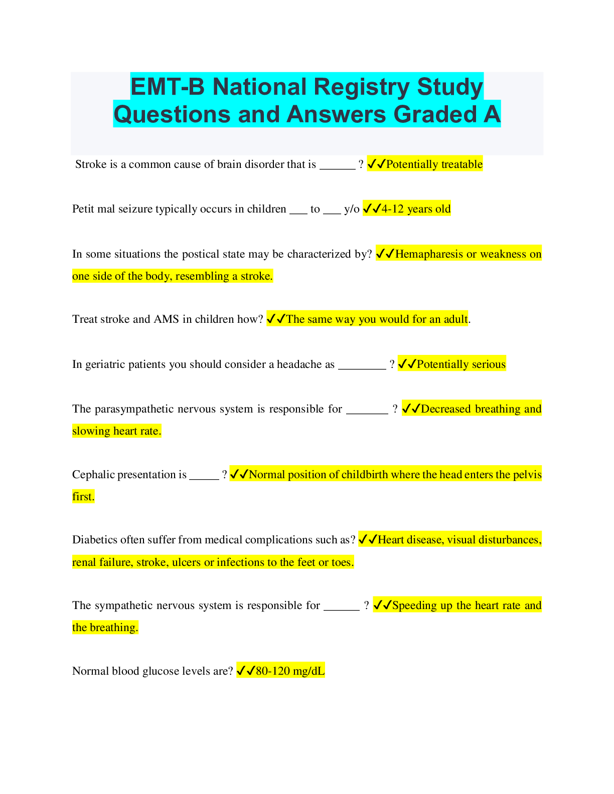 Health Care> EXAM > EMT-B National Registry Study Questions and Answers Graded A (All)