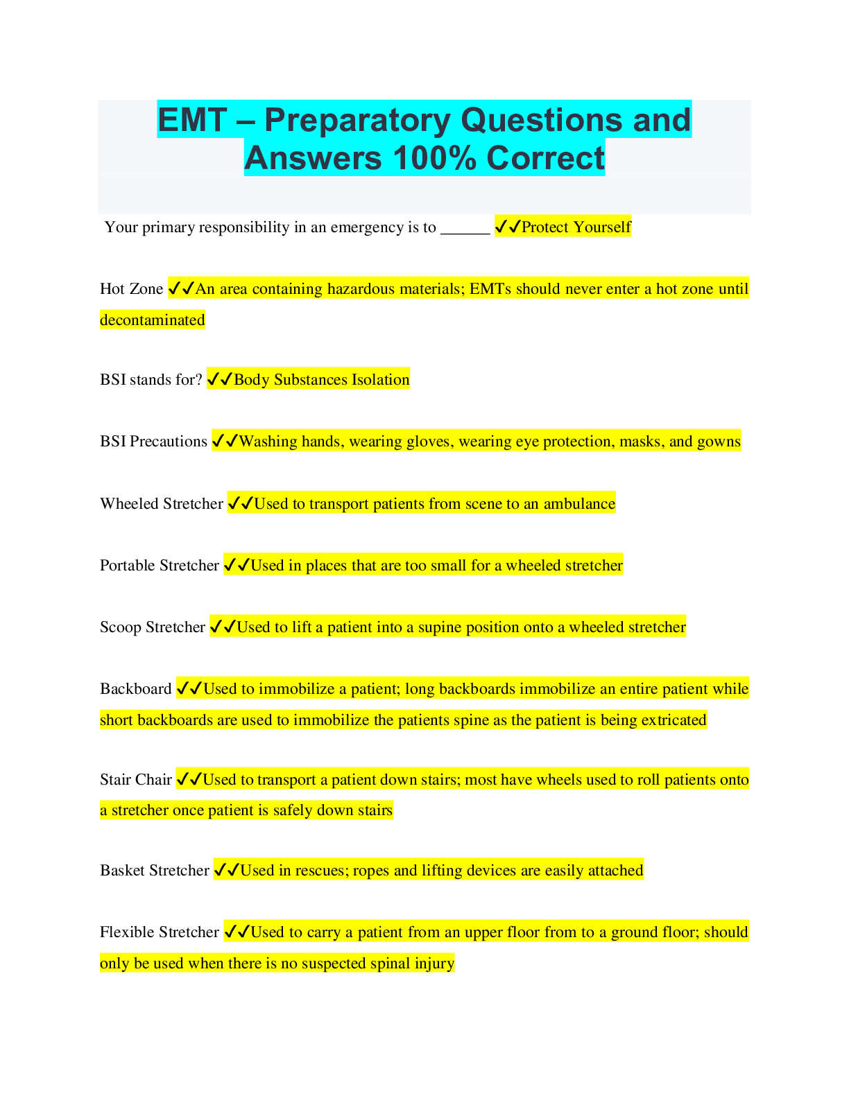 Health Care> EXAM > EMT – Preparatory Questions and Answers 100% Correct (All)