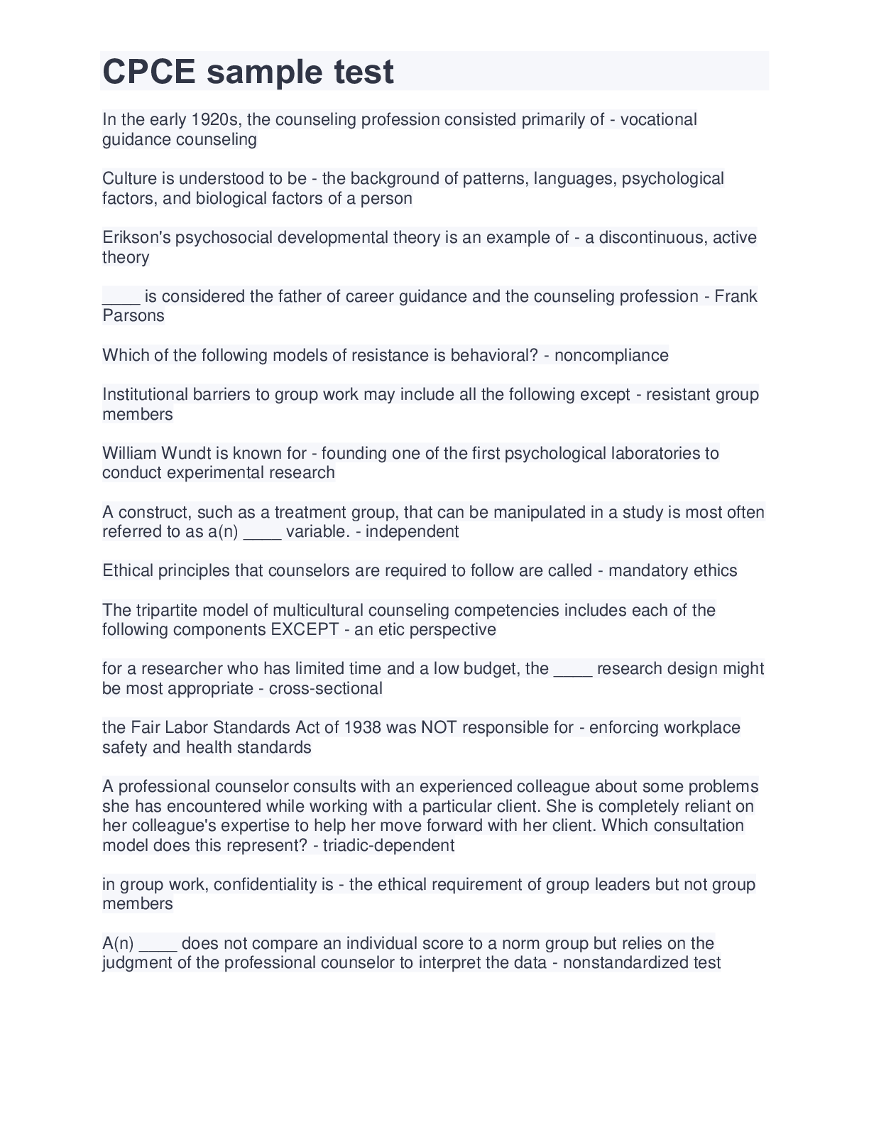 Health Care> EXAM > CPCE sample test| 140 QUESTIONS| WITH COMPLETE ANSWERS (All)