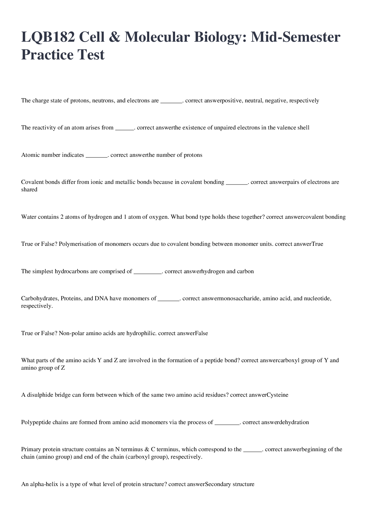 Health Care> EXAM > LQB182 Cell & Molecular Biology: Mid-Semester Practice Test| ANSWERS VERIFIED (All)