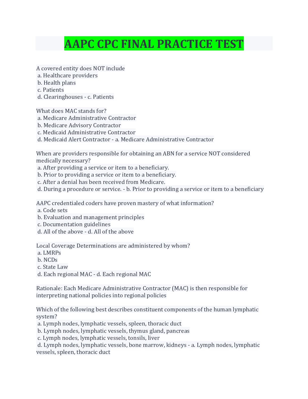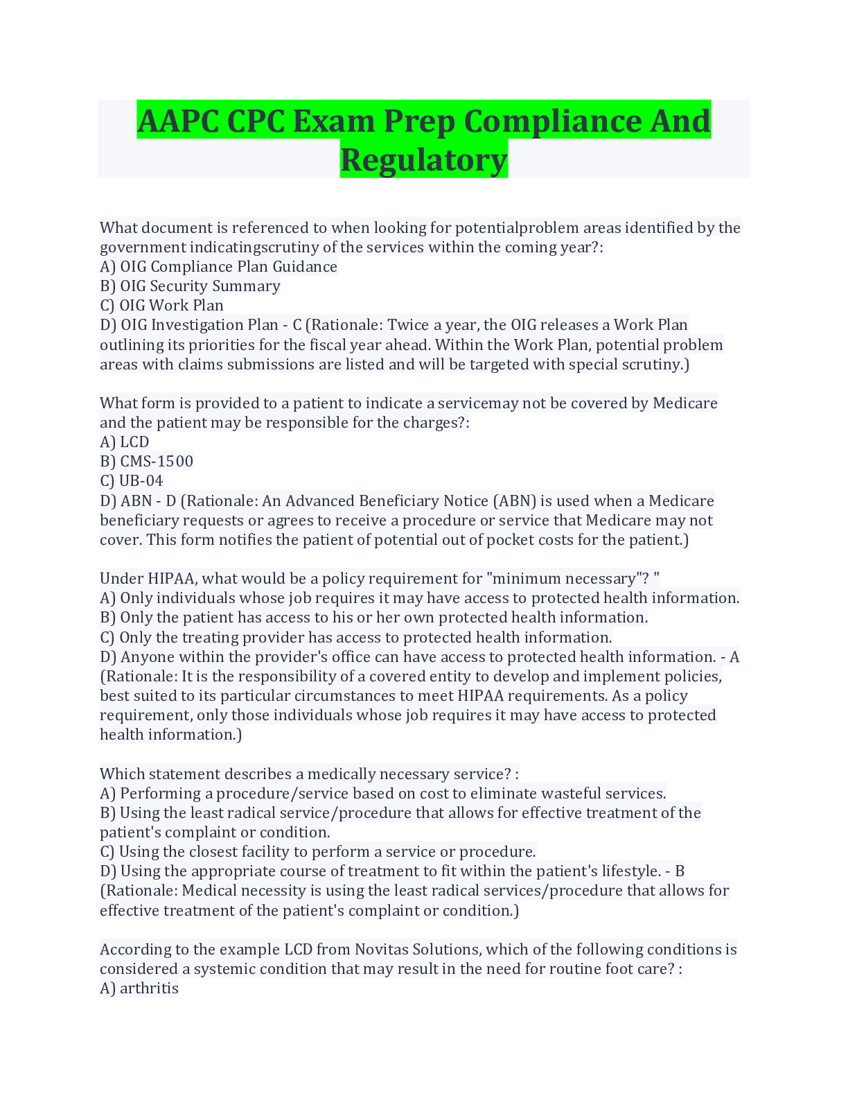 AAPC CPC Exam Prep Compliance And Regulatory Questions And Answers With Complete Solution
