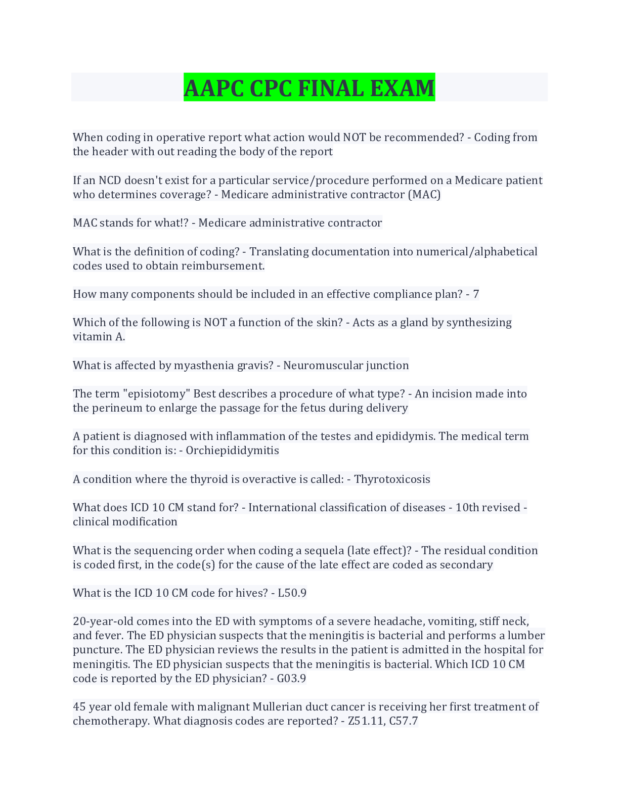 AAPC CPC FINAL EXAM QUESTIONS AND ANSWERS WITH COMPLETE SOLUTION .