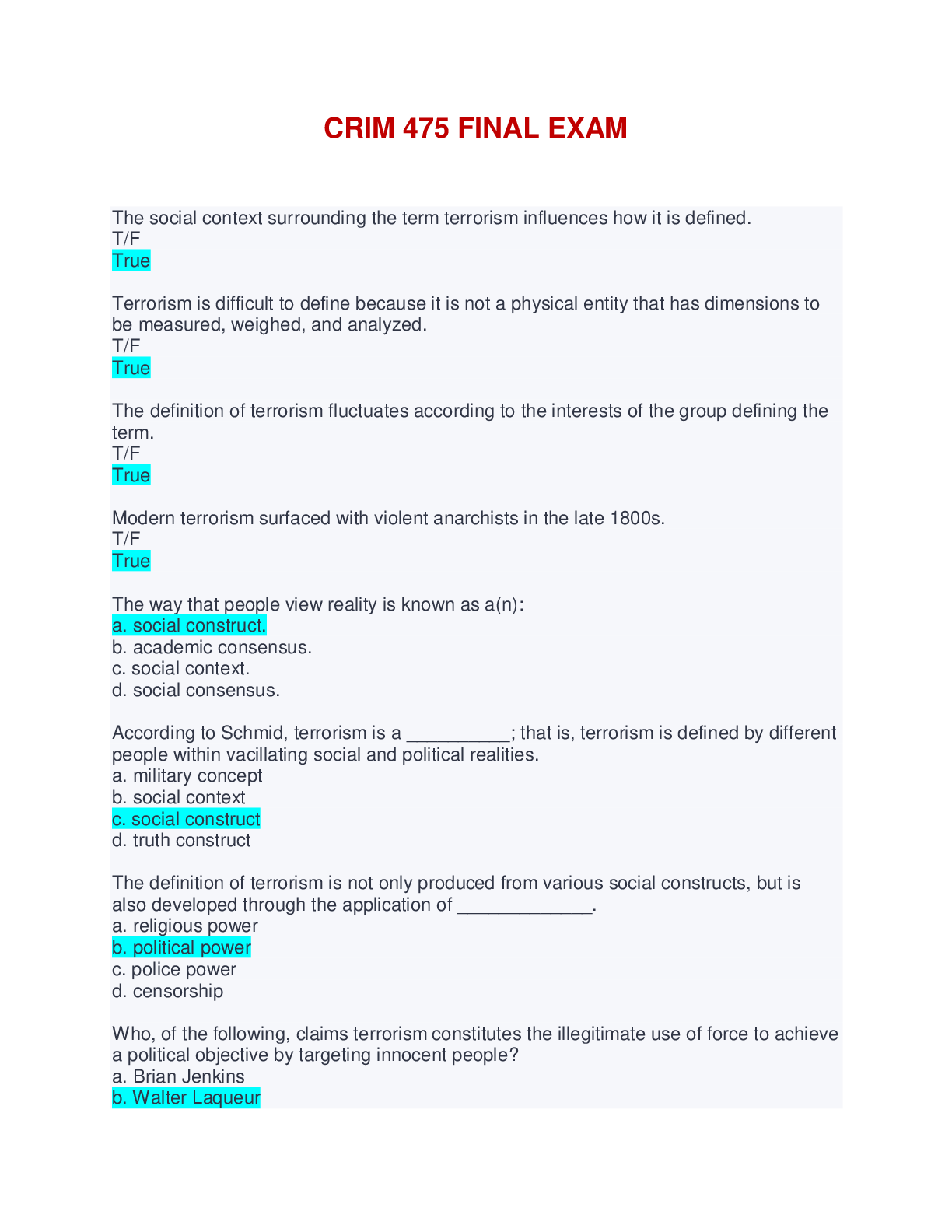 CRIM 475 FINAL EXAM The social context surrounding the term terrorism influences how it is defined. T/F True Terrorism is difficult to define because it i s not a physical entity that has dimensions t...