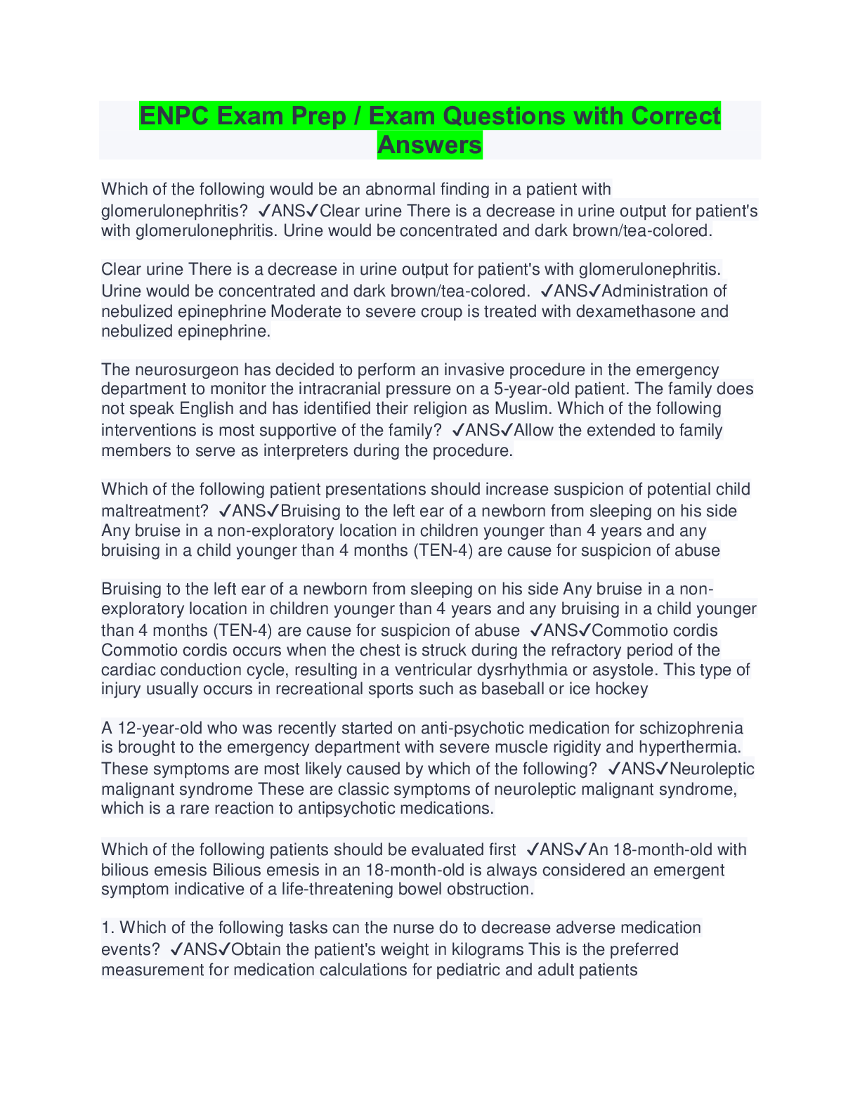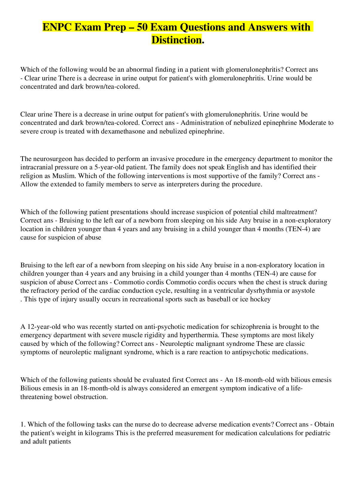 Health Care> EXAM > ENPC Exam Prep – 50 Exam Questions and Answers with Distinction. (All)