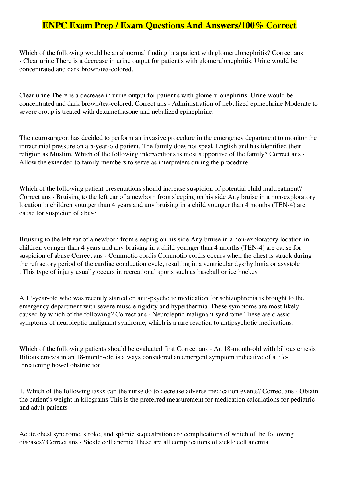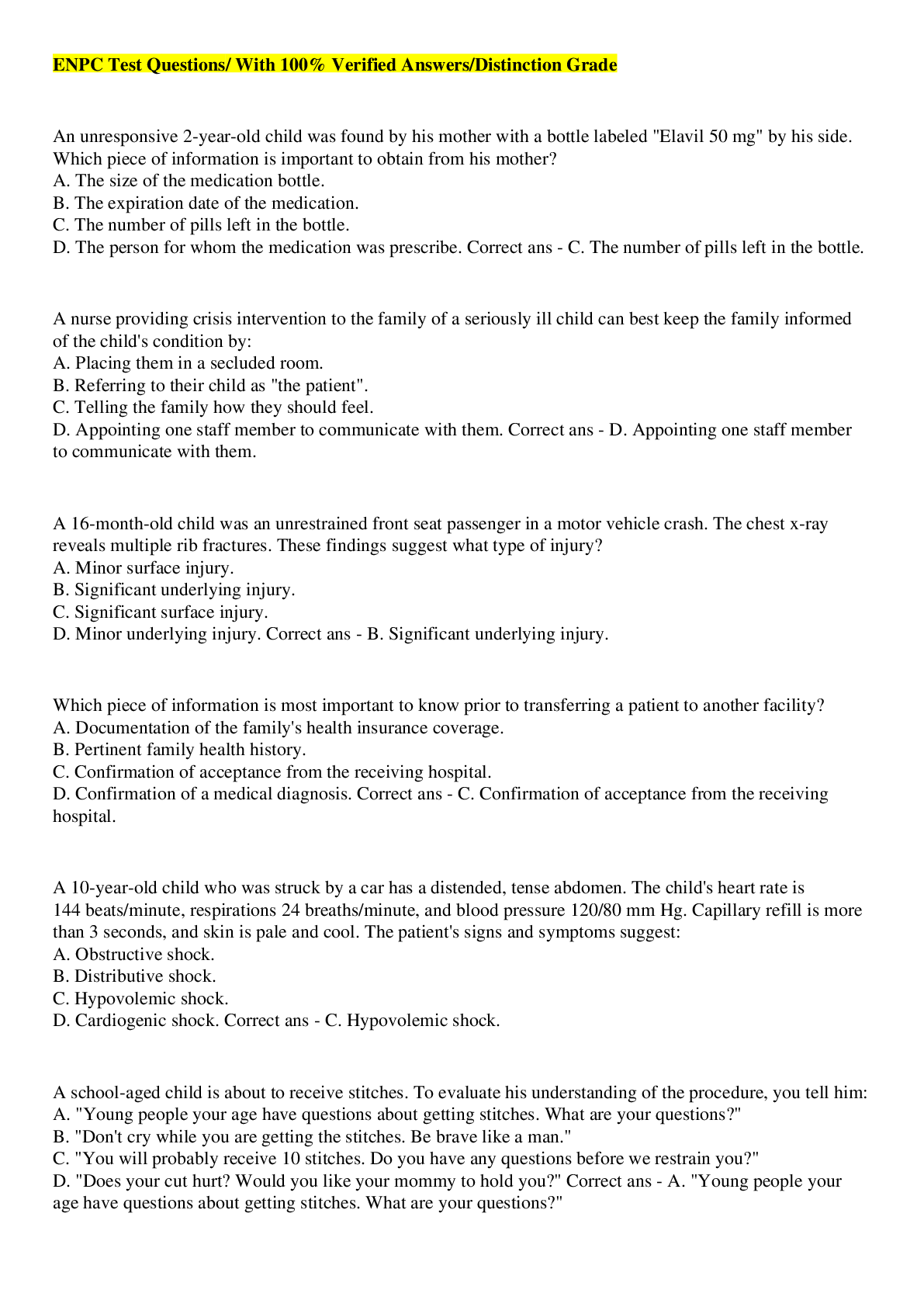 Health Care> EXAM > ENPC Test Questions/ With 100% Verified Answers/Distinction Grade (All)