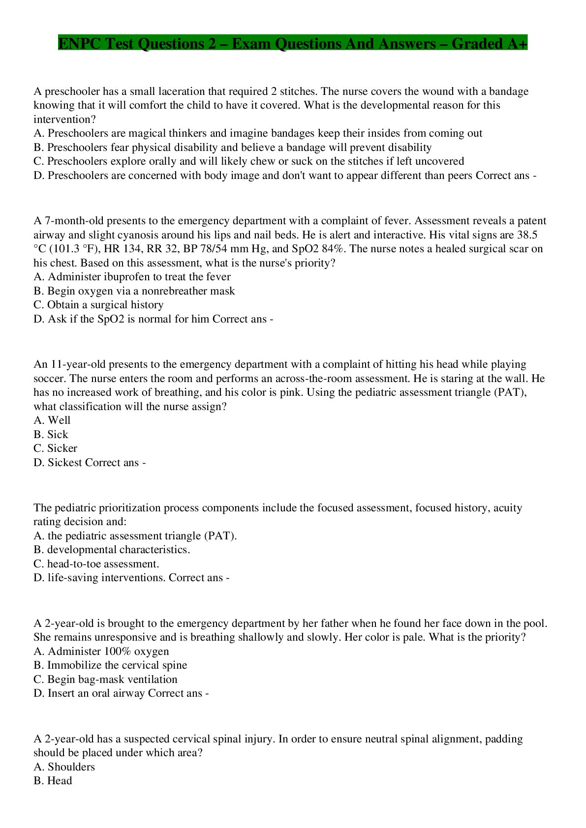 Health Care> EXAM > ENPC Test Questions 2 – Exam Questions And Answers – Graded A+ (All)