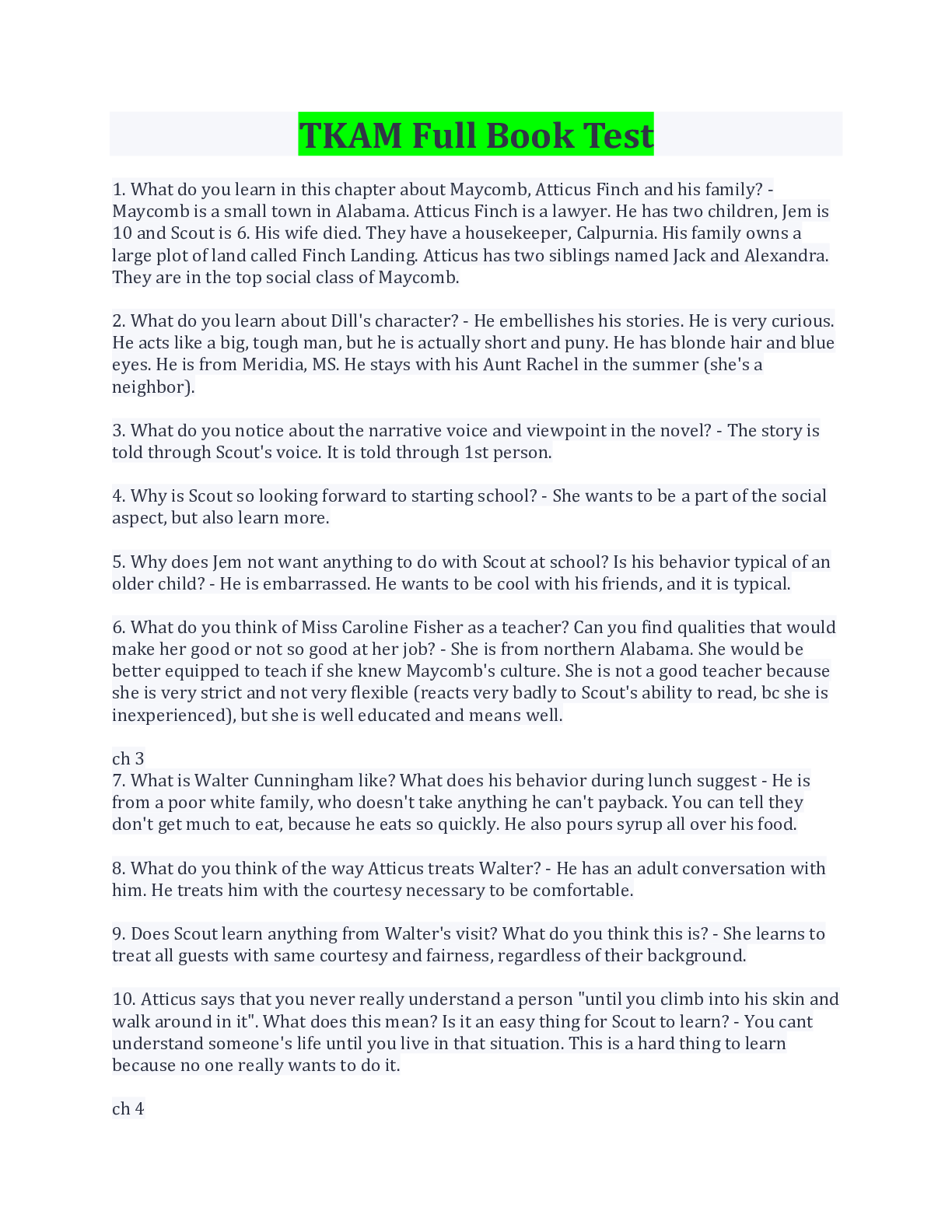 TKAM Full Book Test Questions And Answers 2022/2023