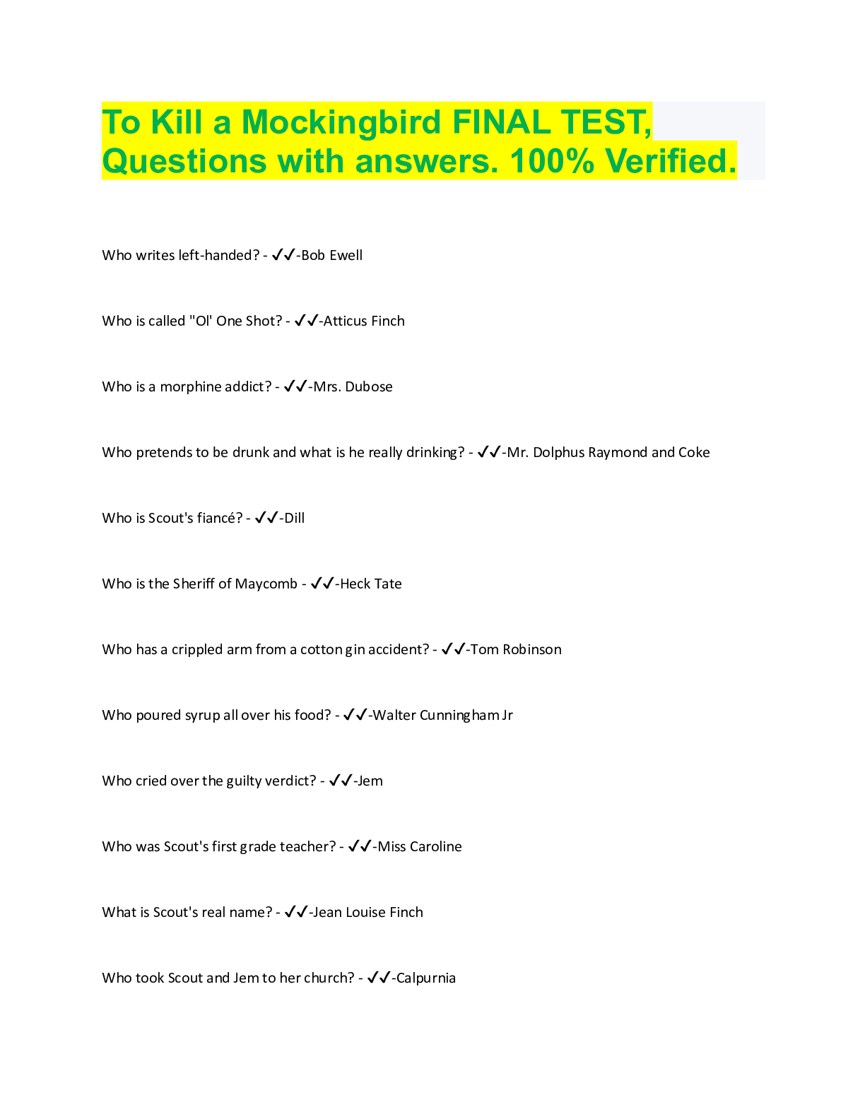 English> EXAM > To Kill a Mockingbird FINAL TEST Questions And Answers Latest Update (All)
