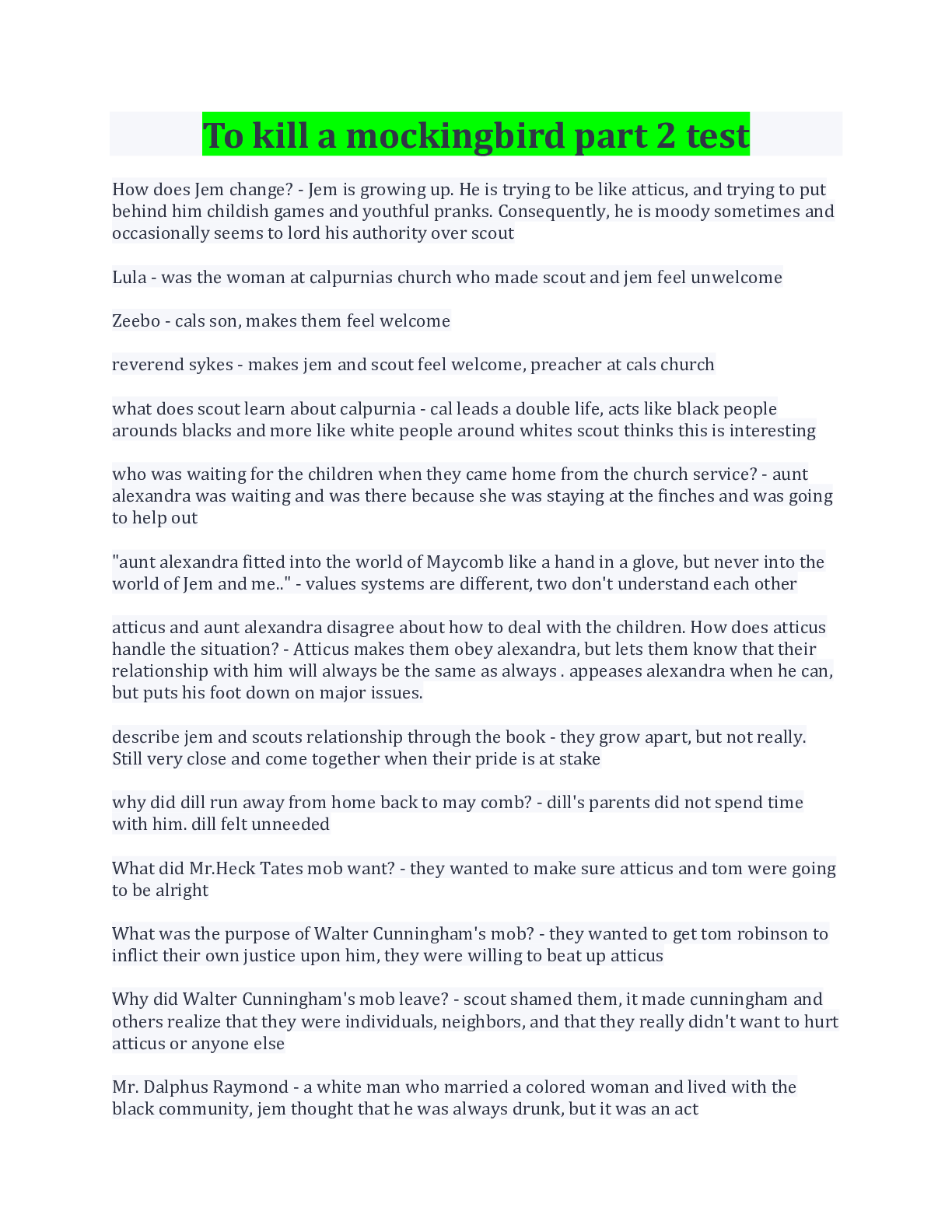 English> EXAM > To kill a mockingbird Part 2 Test Questions And Answers (All)