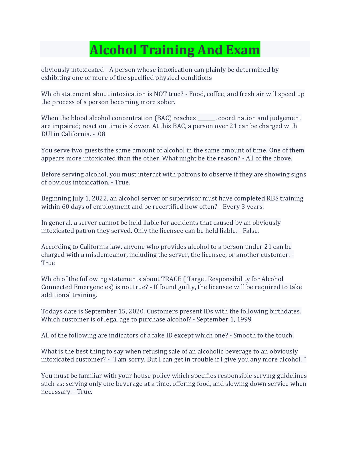 Health Care> EXAM > Alcohol Training And Exam 2022/2023 Latest Update (All)