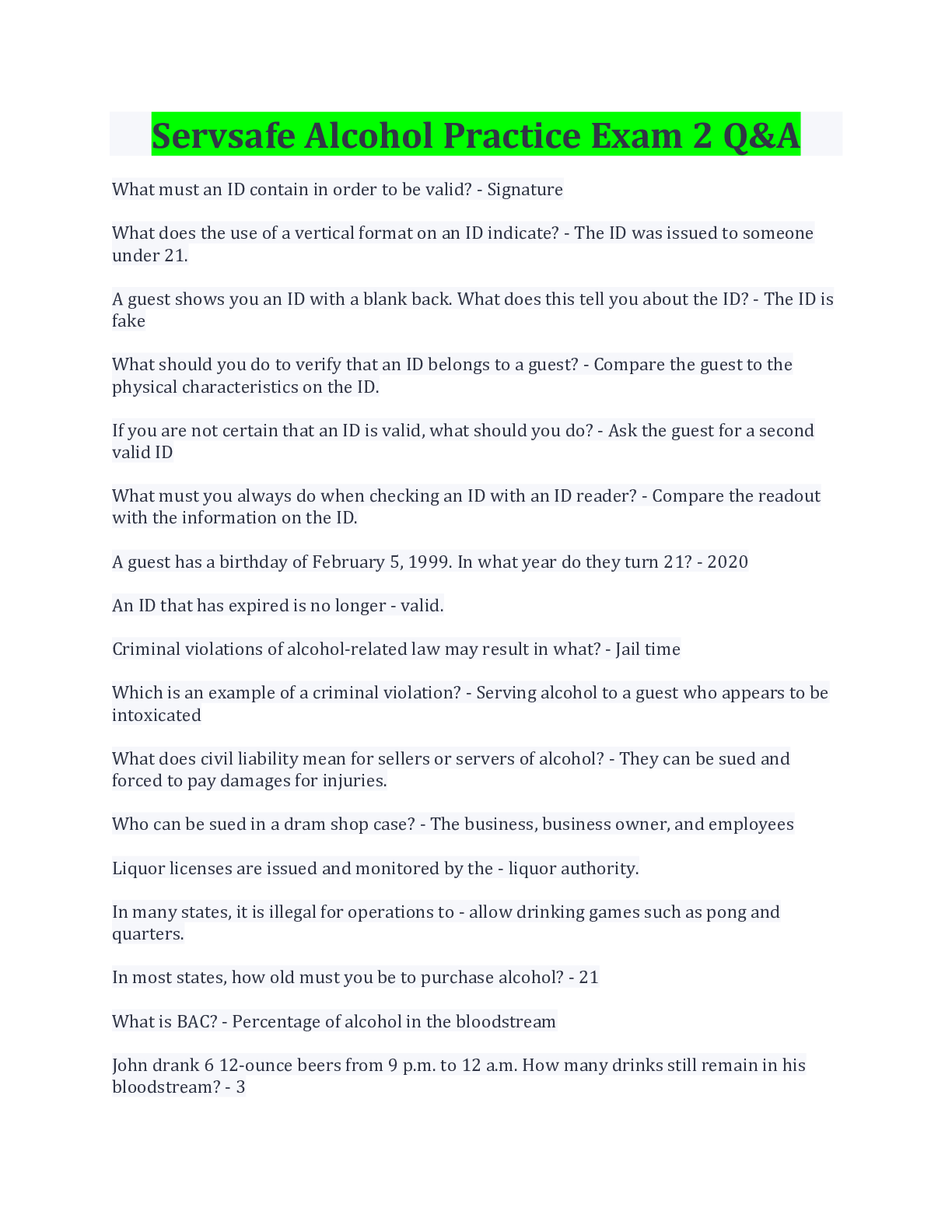 Servsafe Alcohol Practice Exam 2 Q&A Latest Update