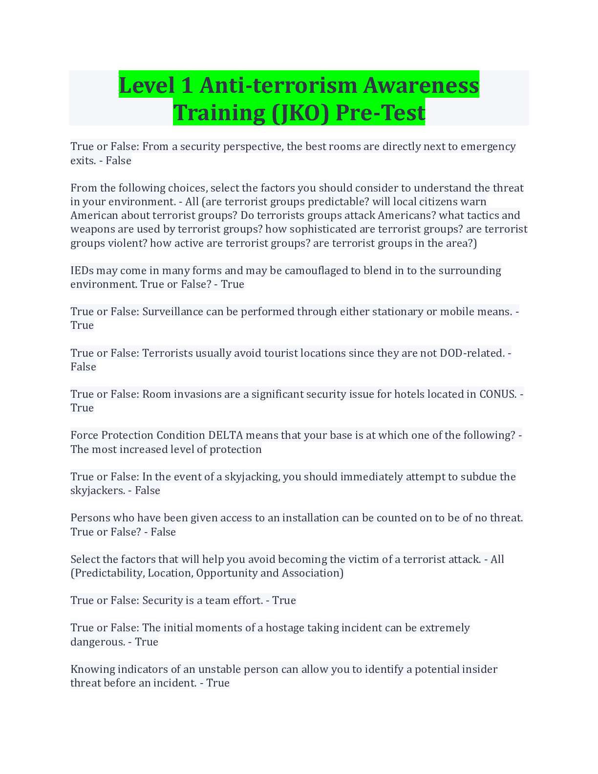 Level 1 Anti-terrorism Awareness Training (JKO) Pre-Test Latest Update