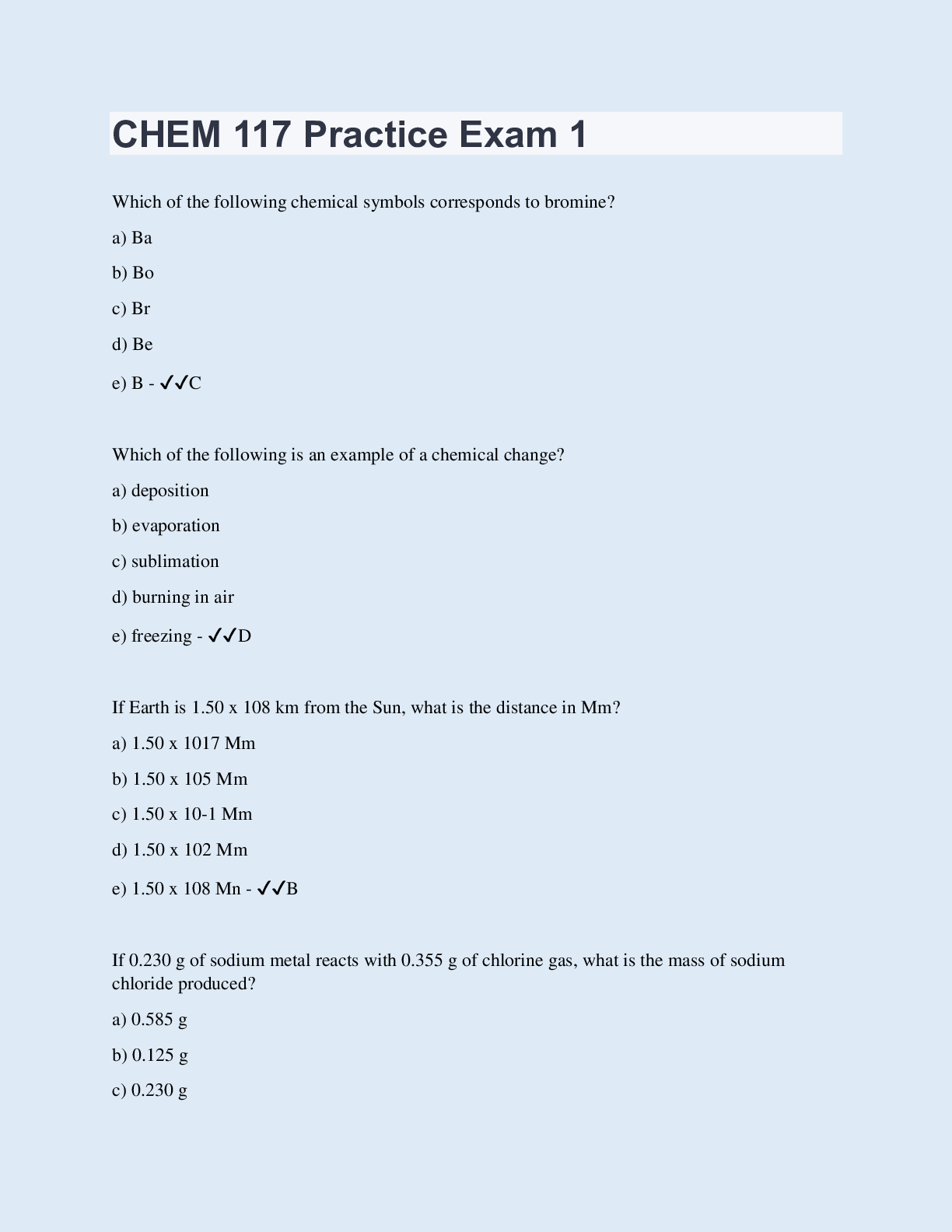 Chemistry> EXAM > CHEM 117 Practice Exam 1 | 50 Questions with 100% Correct Answers | Updated & Verified (All)