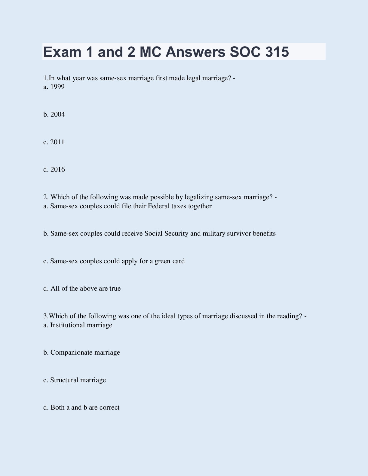 1.In what year was same-sex marriage first made legal marriage? - a. 1999 b. 2004 c. 2011 d. 2016 2. Which of the following was made possible by legalizing same-sex marriage? - a. Same-sex coupl...