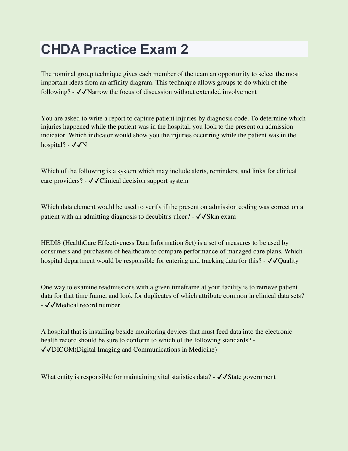Health Care> EXAM > CHDA Practice Exam 2 | 150 Questions with 100% Correct Answers | Updated & Verified (All)