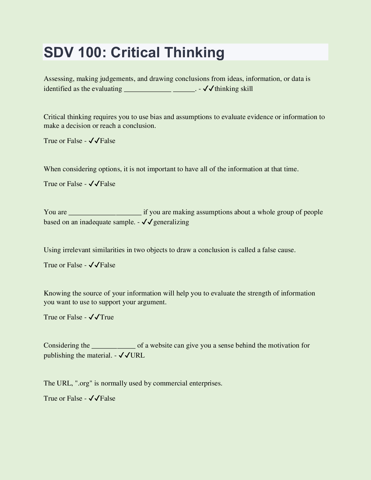 Education> QUESTIONS & ANSWERS > SDV 100: Critical Thinking | Questions with 100% Correct Answers | Updated & Verified (All)