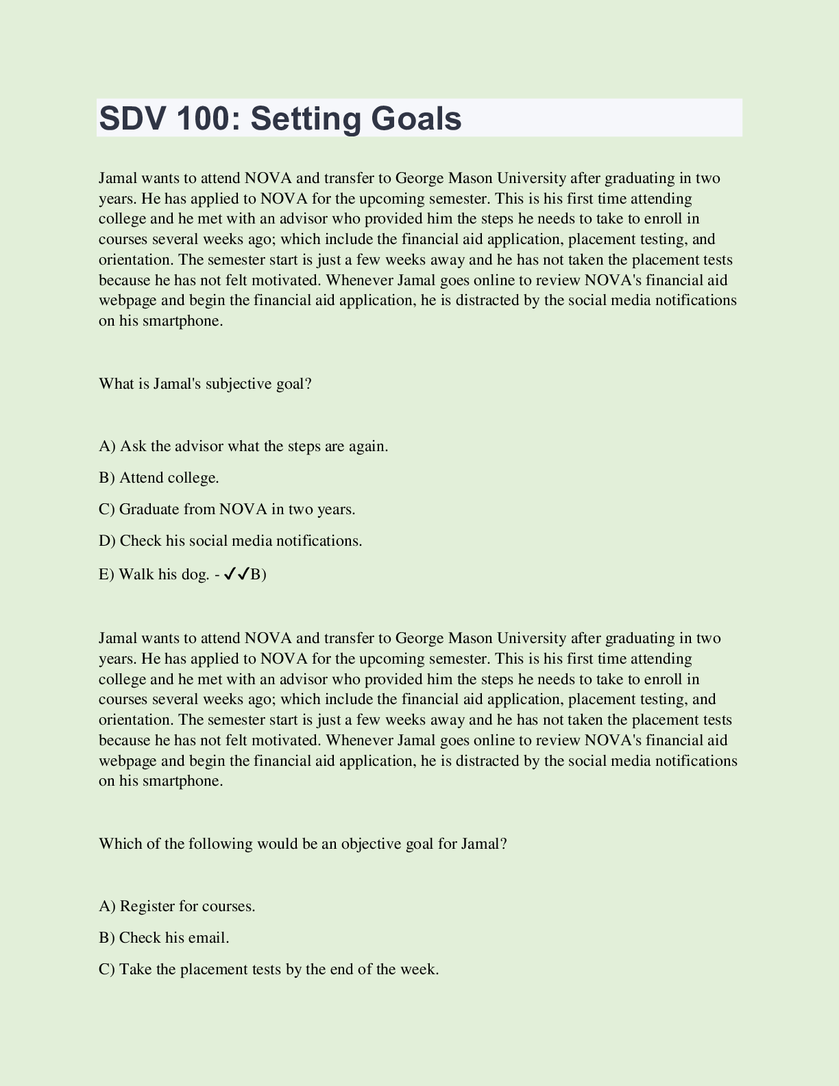 Education> QUESTIONS & ANSWERS > SDV 100: Setting Goals | Questions with 100% Correct Answers | Updated & Verified (All)