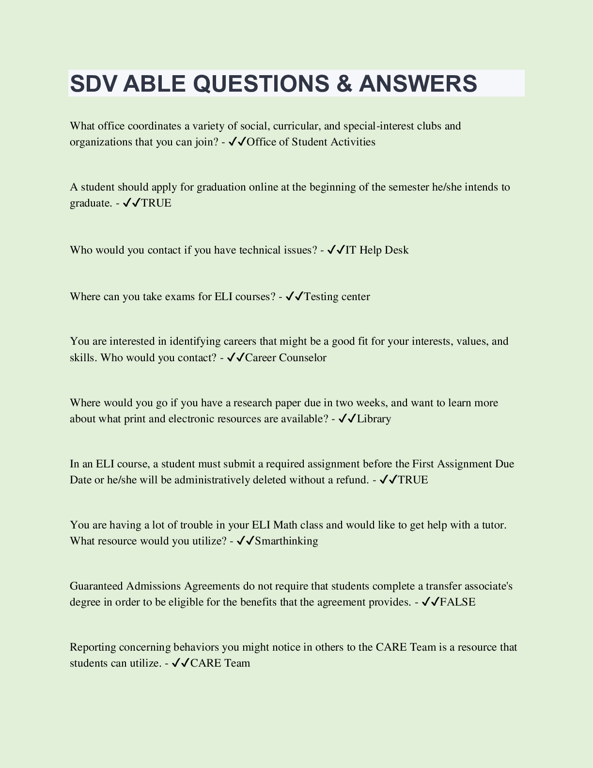 Education> QUESTIONS & ANSWERS > SDV ABLE QUESTIONS & ANSWERS | 110 Questions with 100% Correct Answers | Updated & Verified (All)