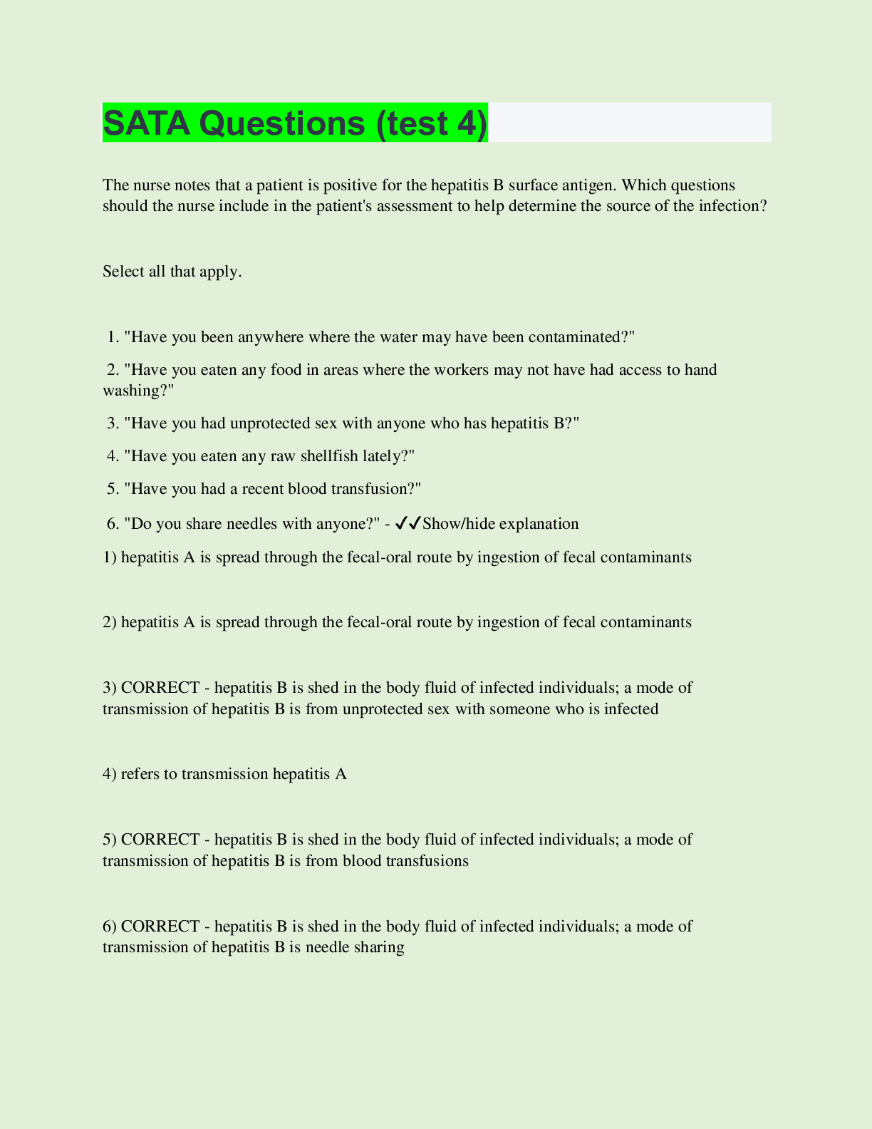 The nurse notes that a patient is positive for the hepatitis B surface antigen. Which questions should the nurse include in the patient's assessment to help determine the source of the infection? Se...