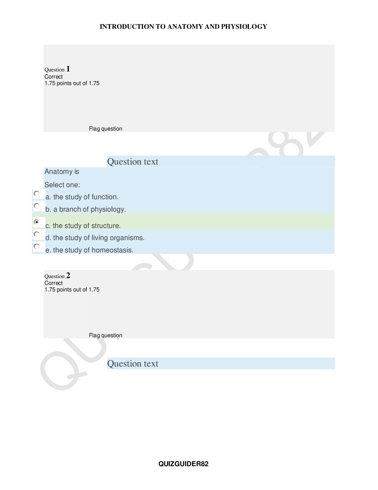 Question 1 Correct 1.75 points out of 1.75 Flag question Question text Anatomy is Select one: a. the study of function. b. a branch of physiology. c. the study of structure. d. the study of...