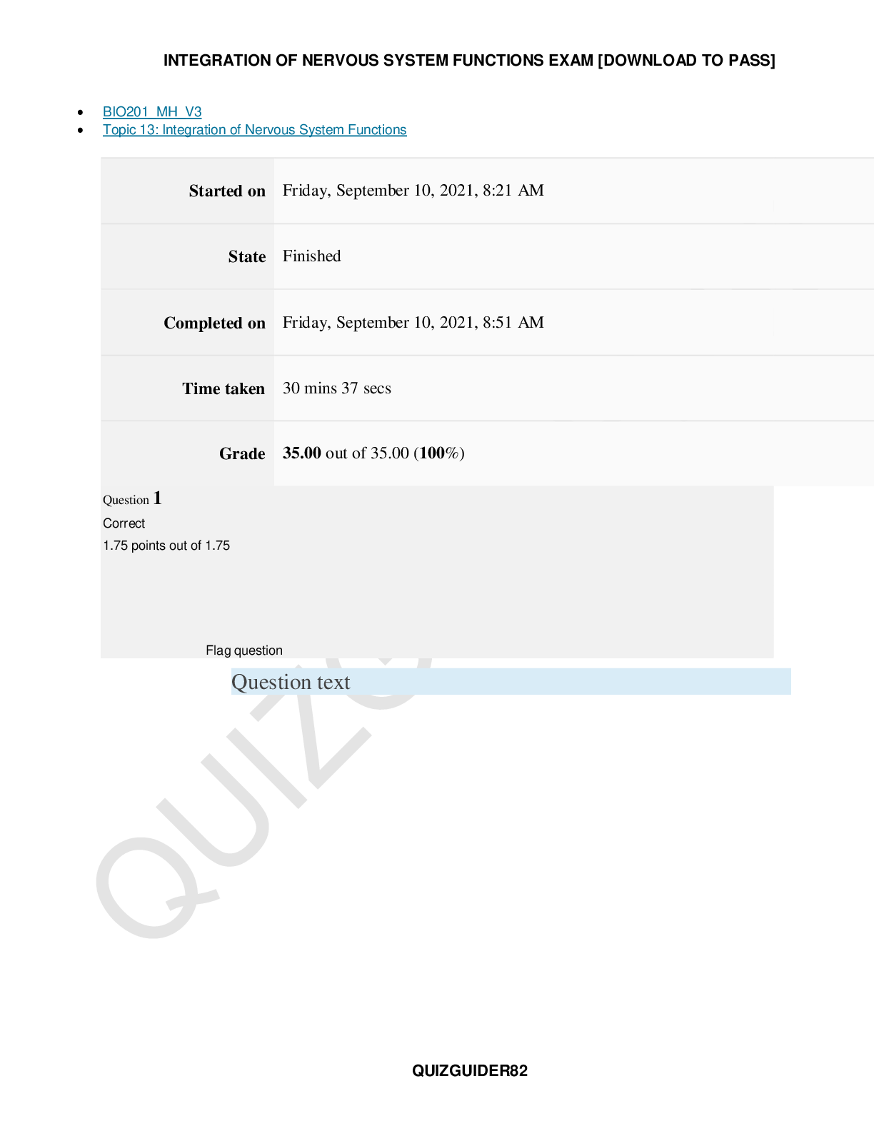 BIO201_MH_V3 Topic 13: Integration of Nervous System Functions Started on Friday, September 10, 2021, 8:21 AM State Finished Completed on Friday, September 10, 2021, 8:51 AM Time taken 30 mins...