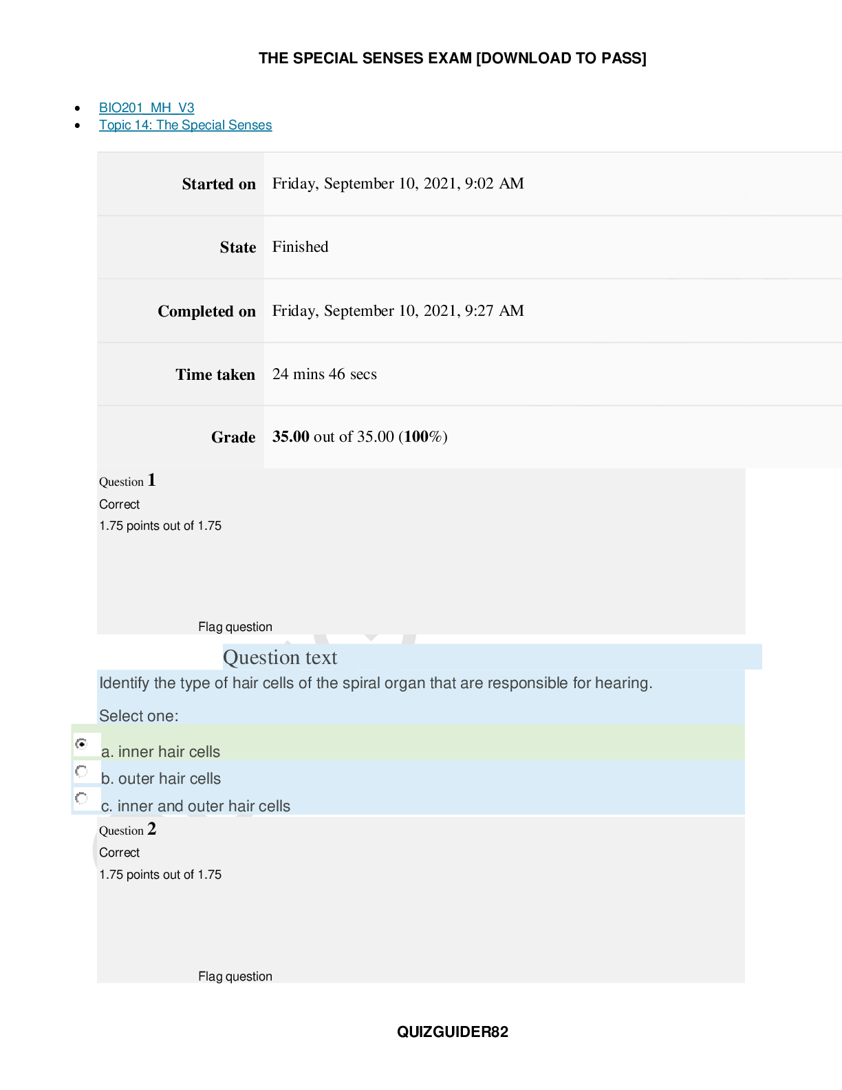 BIO201_MH_V3 Topic 14: The Special Senses Started on Friday, September 10, 2021, 9:02 AM State Finished Completed on Friday, September 10, 2021, 9:27 AM Time taken 24 mins 46 secs Grade 35.00...